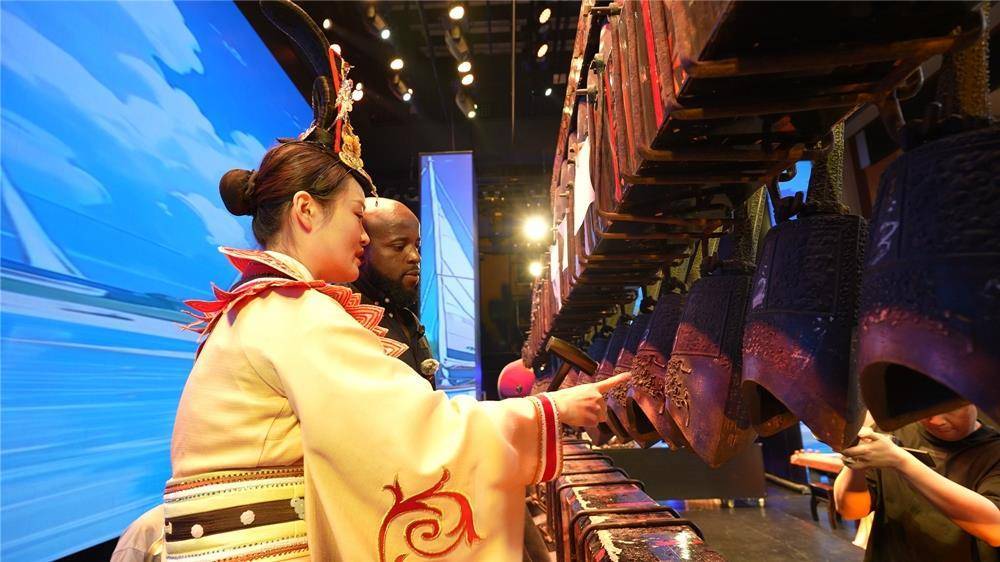盧旺達(dá)留學(xué)生Mike Paul在湖北省博物館編鐘演奏員指導(dǎo)下,用曾侯乙編鐘復(fù)制件敲響《歡樂頌》。 (張燦 攝)