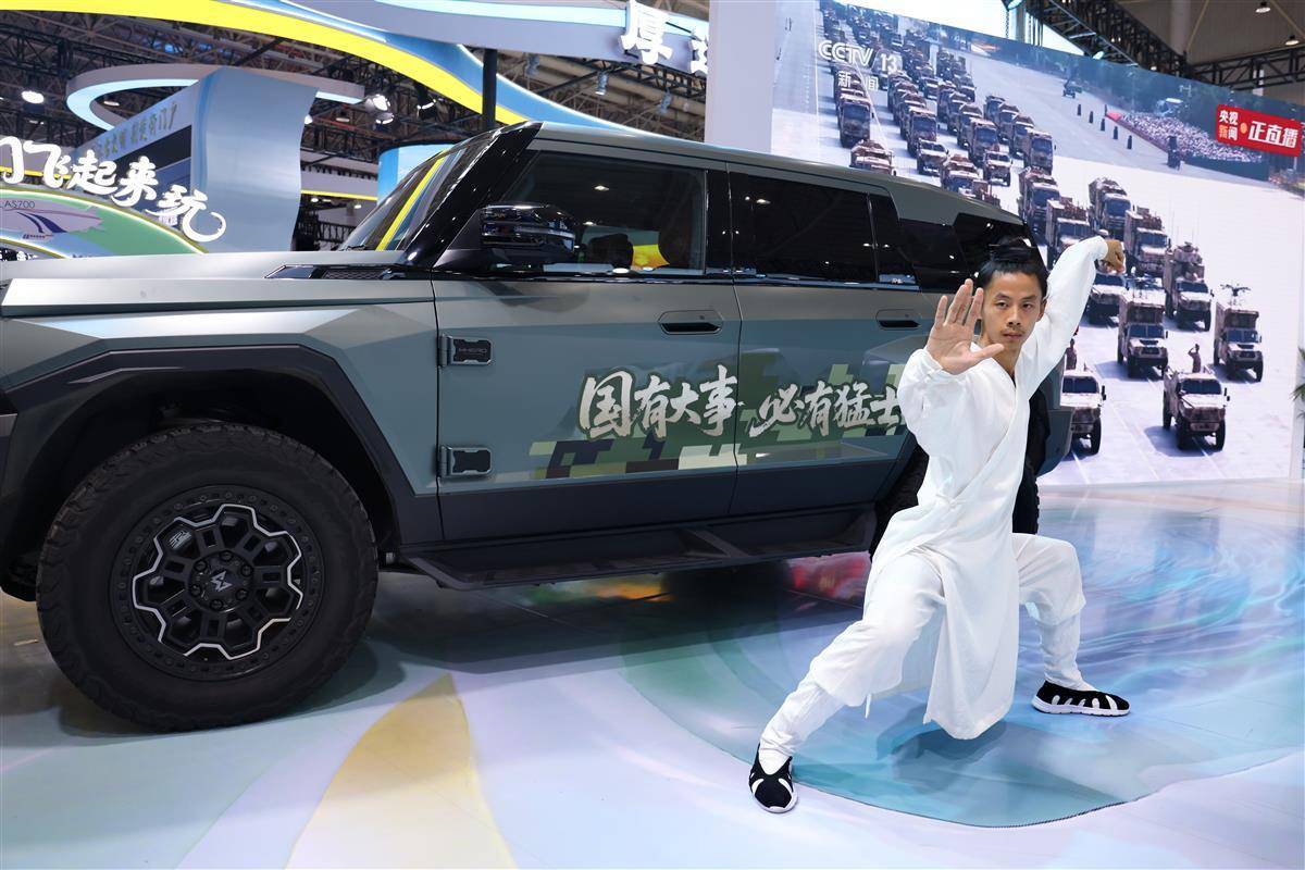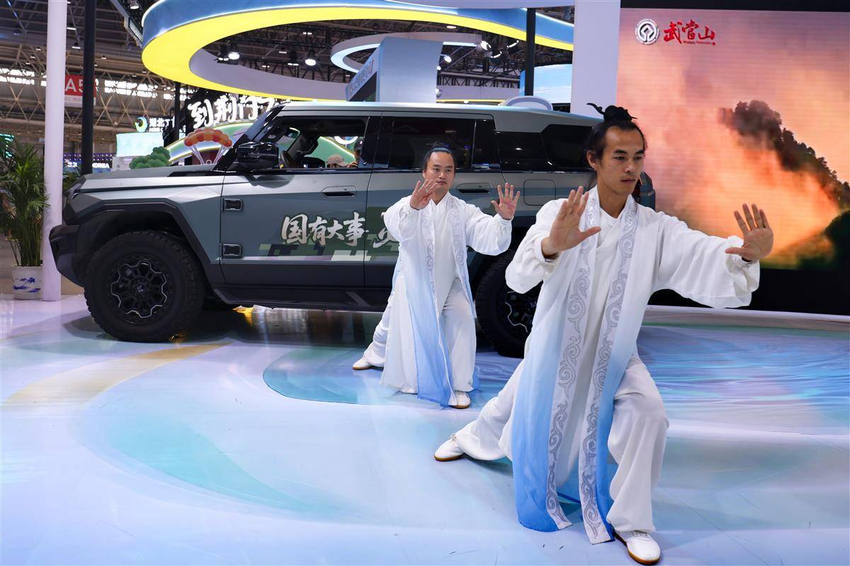 展區入口處,一輛東風猛士軍車氣勢凜然,成為觀眾爭相打卡的熱門背景。自1984年至今,十堰制造的東風軍車已七次榮膺閱兵盛典,不久前“九三閱兵”中的出色表現,再次印證了“國有大事,必有東風”的品牌實力。與之呼應的是武當太極的柔美與深邃——表演者行云流水的一招一式,不僅展現武術之美,更傳遞出武當文化深厚的哲學內涵。