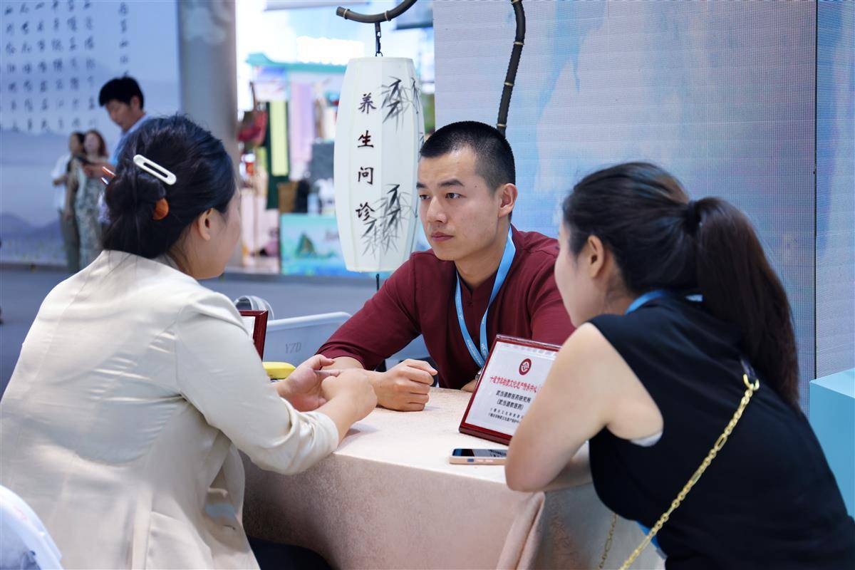 望、聞、問、切——展區內的武當中醫問診臺前早早排起長隊,成為眾多關注健康觀眾的焦點。不論男女老少,皆挽袖伸手、躍躍欲試。這一“武當養生”空間將問診、“抓藥”、品茶有機串聯,觀眾可在健康顧問引導下體驗道醫診療,步入“武當小茶館”挑選藥材玩偶、品鑒道茶和黃精制品、有機食材等一系列“藥食同源”產品,還可把太極元素文創帶回家,實現傳統智慧與現代康養的溫情對接。