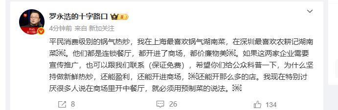 下播后,羅永浩再次發文:“平民消費級別的鍋氣熱炒,我在上海最喜歡鍋氣湖南菜,在深圳最喜歡農耕記湖南菜。他們都是連鎖餐廳,都開進了商場,都價廉物美。如果這兩家企業需要宣傳推廣,也可以跟我們聯系(保證免費),希望你們給公眾科普一下,為什么堅持做新鮮熱炒,還能盈利,還能開進商場,還能開那么多的店。我現在特別討厭很多人說在商場里開中餐廳,就必須用預制菜的說法。”