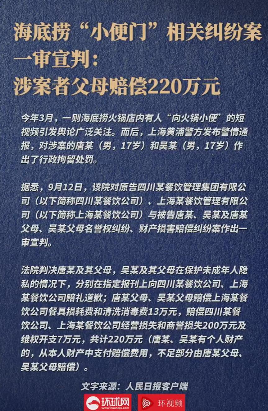 據人民日報報道,9月12日,該院判決唐某及其父母,吳某及其父母在保護未成年人隱私的情況下,分別在指定報刊上向四川某餐飲公司、上海某餐飲公司賠禮道歉;唐某父母、吳某父母賠償兩家公司各項損失共計220萬元(唐某、吳某有個人財產的,從本人財產中支付賠償費用,不足部分由唐某父母、吳某父母賠償)。