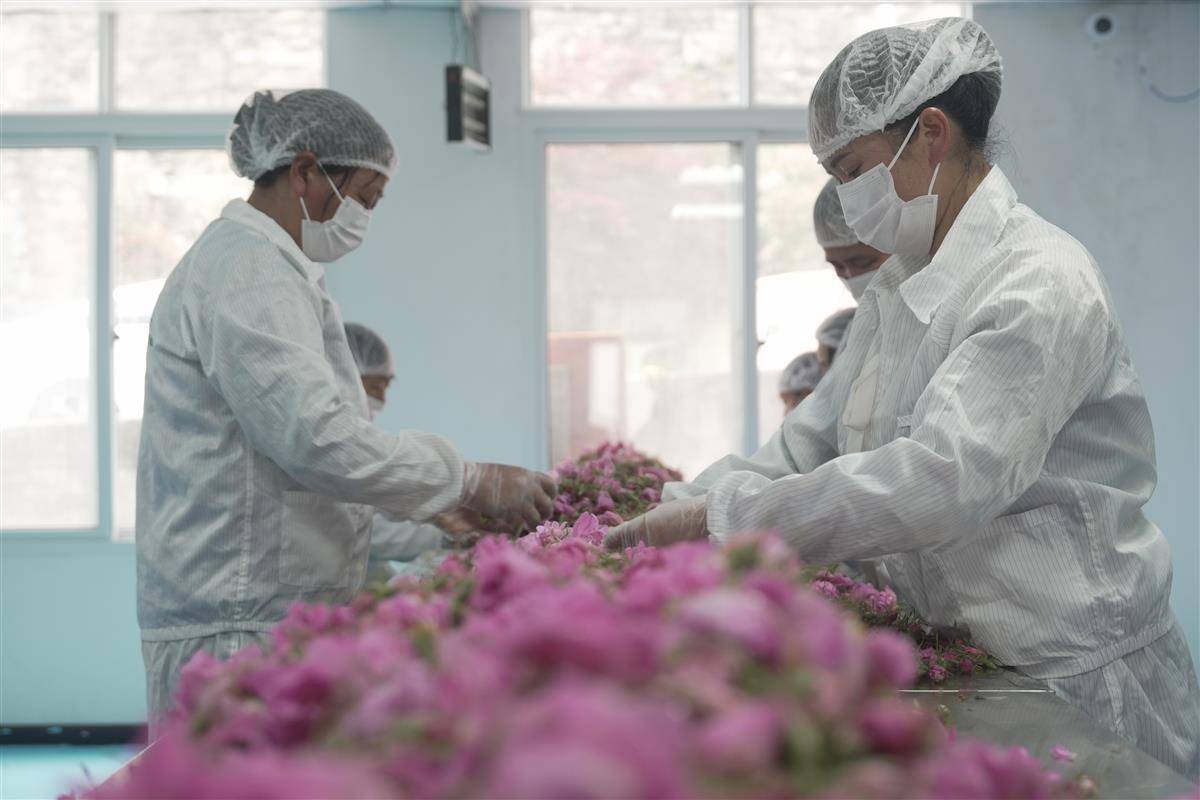 目前,陳開軍的玫瑰基地已擴展到3000畝,發展為“種植 + 加工 + 銷售”的完整產業鏈,200余戶村民從傳統糧農轉型為“田間摘花、工廠做工”的復合型職業花農。