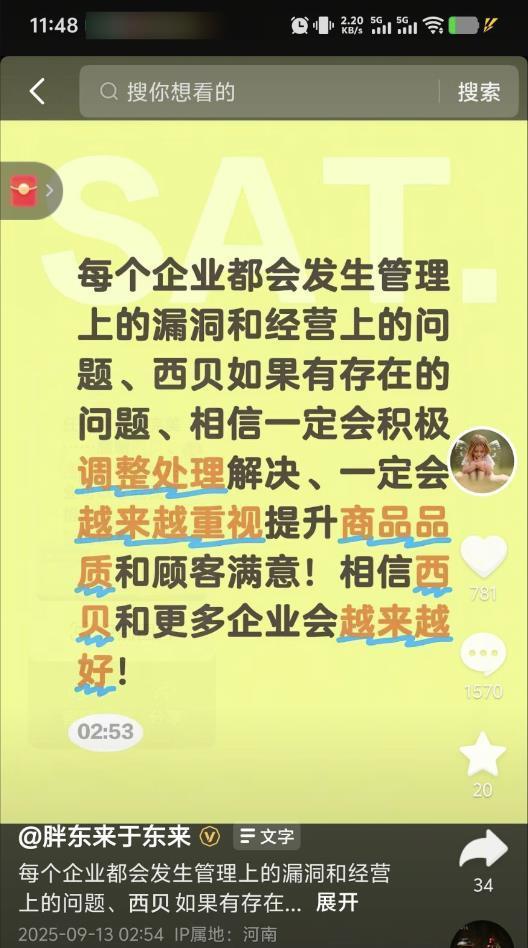 9月13日凌晨,于東來在個人抖音賬號曾兩度發文,其中提到:“每個企業都會發生管理上的漏洞和經營上的問題,西貝如果有存在的問題,相信一定會積極調整處理解決、一定會越來越重視提升商品品質和顧客滿意。相信西貝和更多企業會越來越好!”