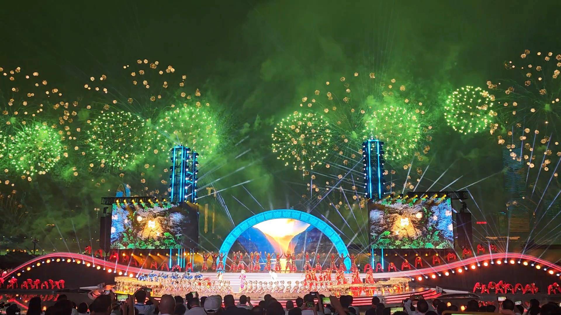 無人機噴射冷煙花、七彩祥云立體光影、燈光秀水天相接,配合舞臺表演,構(gòu)建起“江岸-江面-天際”三位一體的展演空間,令現(xiàn)場觀眾連連驚嘆:“太震撼了,值了!”