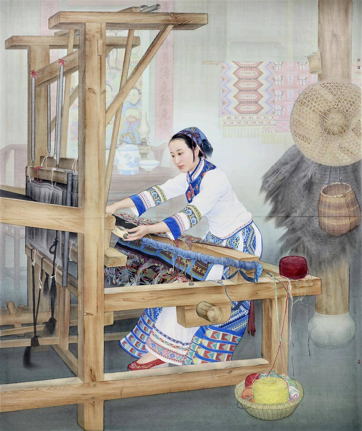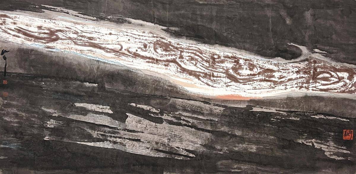 這些作品既延續了美術創作扎根生活、融入時代的優良傳統,還體現了當代藝術家對生態保護、文化傳承等重大題材的深刻思考。其中, 周韶華的中國畫《不盡長江萬古流》、唐小禾的油畫《屈原故里——秭歸》、劉萬鳴的中國畫《鶴鳴清風》,從不同視角禮贊長江。李乃蔚的工筆畫《土家織女》表現土家少女編織西蘭卡普的畫面,寄托對美好生活的憧憬。許奮版畫《奔蕩》以水與石的對話,表達對母親河的深情。
