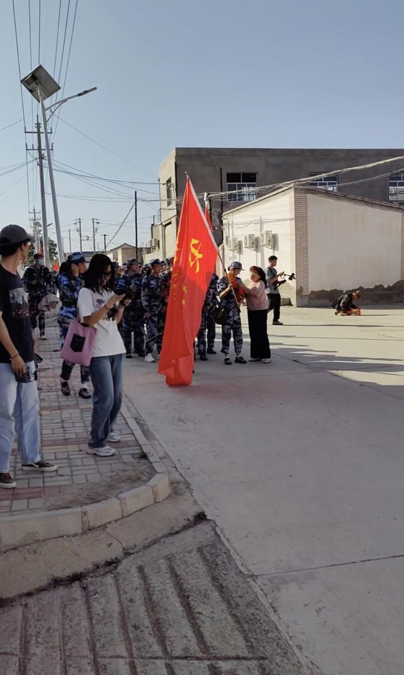 現場給蘭大軍訓新生披紅的村民羅女士向極目新聞記者表示,學生們來的前一天,村里道路兩側就掛上紅旗,剛開始,她還以為這是為國慶節做準備,后來得知是軍訓的學生們徒步拉練要途徑村里,這也是蘭大軍訓拉練的學生們第一次來。
