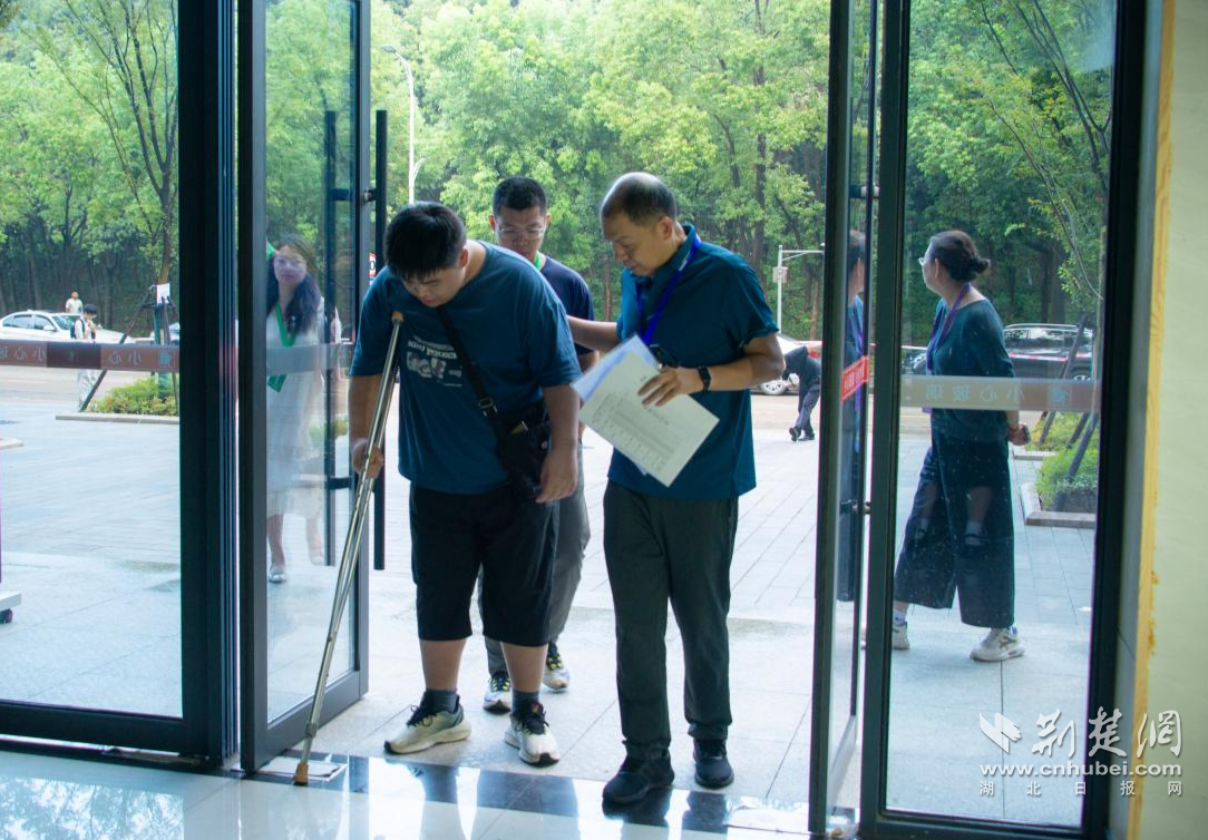 武漢交通職業(yè)學(xué)院考點,一名行動不便考生在工作人員的幫助下順利參考。通訊員供圖