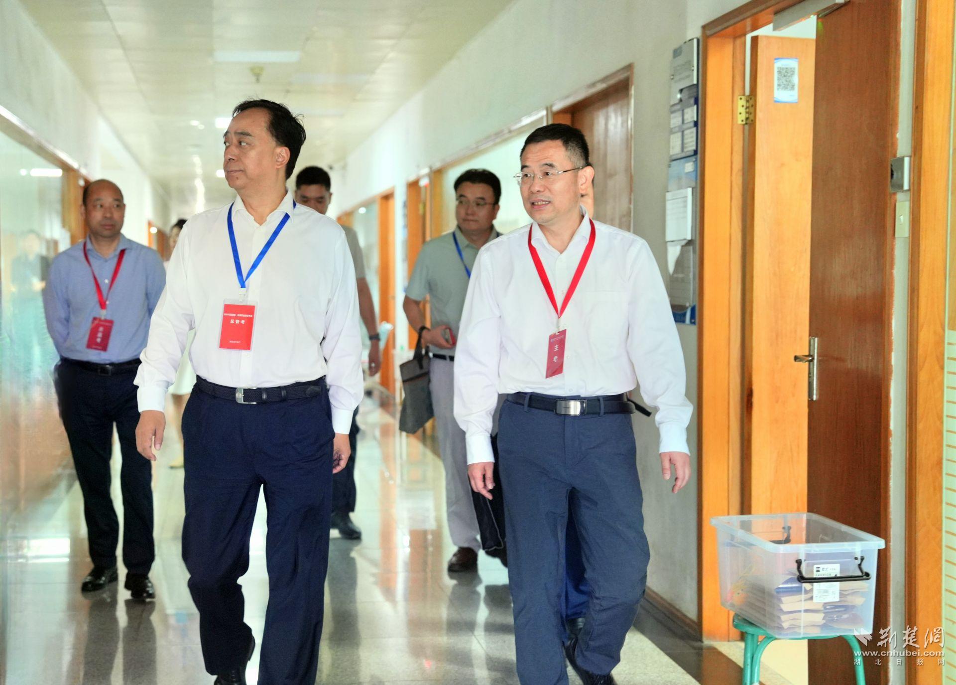 湖北省司法廳黨委書記、廳長楊軍(左)前往武漢軟件工程職業(yè)學(xué)院考點現(xiàn)場巡考。張揚 攝