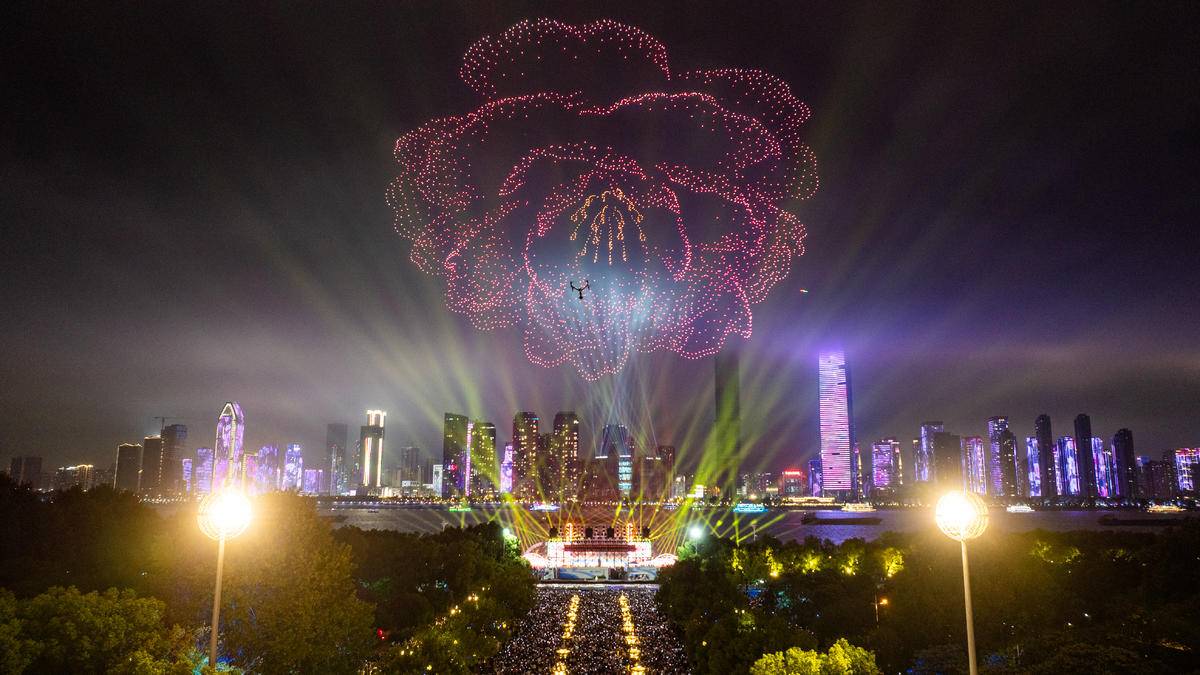 數千架無人機繪成直徑400米的巨型牡丹在夜空綻放。