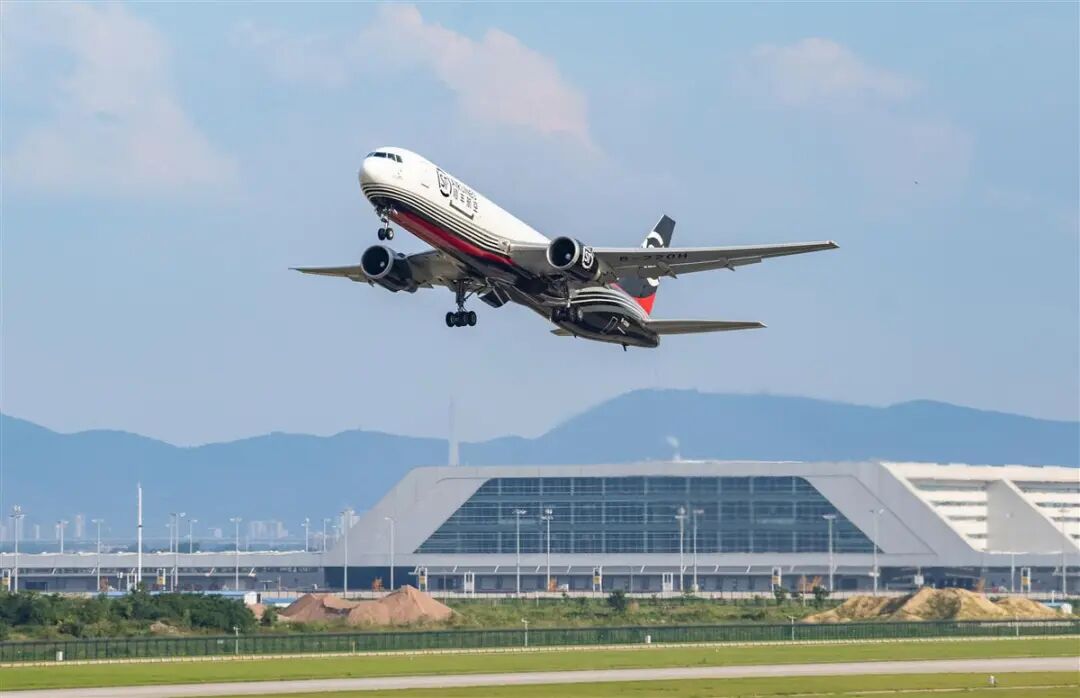 一架B767-300型全貨機(jī)從鄂州花湖國(guó)際機(jī)場(chǎng)起飛,前往印度新德里。