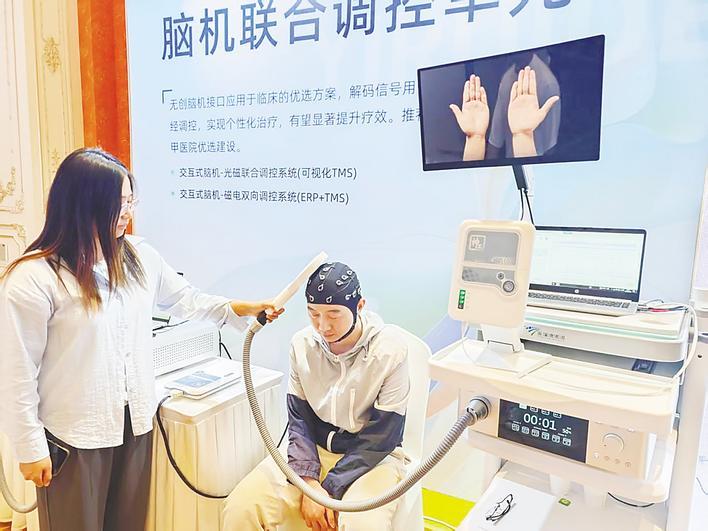 體驗(yàn)者戴上腦電帽,通過運(yùn)動(dòng)想象觸發(fā)經(jīng)顱磁刺激治療。(湖北日?qǐng)?bào)全媒記者 劉潔 攝)