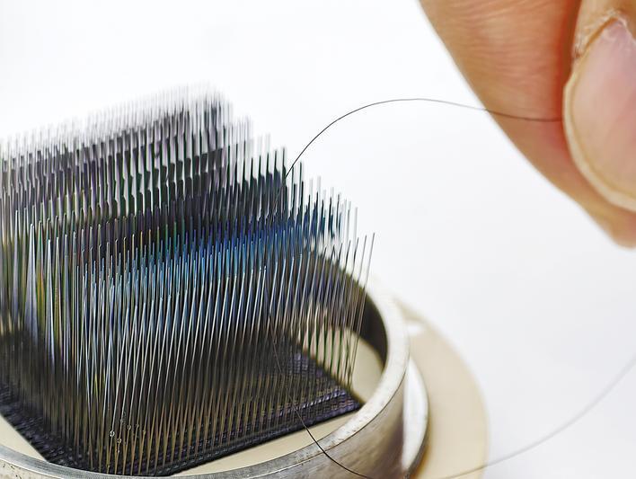 衷華腦機(jī)的高通量植入式腦機(jī)接口系統(tǒng),其“微針”與頭發(fā)絲粗細(xì)相當(dāng)。(湖北日?qǐng)?bào)全媒記者 張燦 攝)