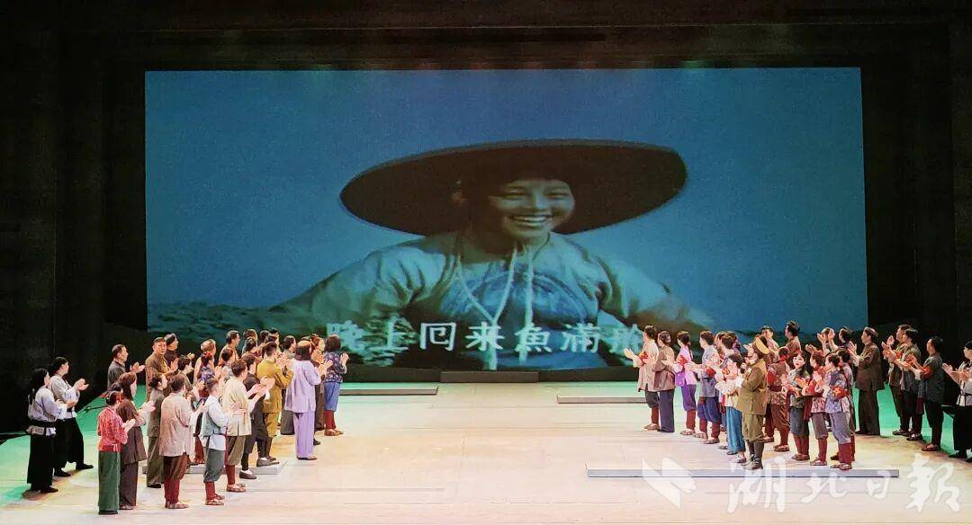 全新演繹,紅色經典魅力盡顯。演出謝幕時,觀眾長時間熱烈鼓掌。此時,劇院播放出老電影《洪湖赤衛隊》中第一代韓英演唱的畫面,老一輩藝術家與舞臺上新一代演員相互呼應,宛如跨越時空的對話,展現了對經典的致敬與傳承。