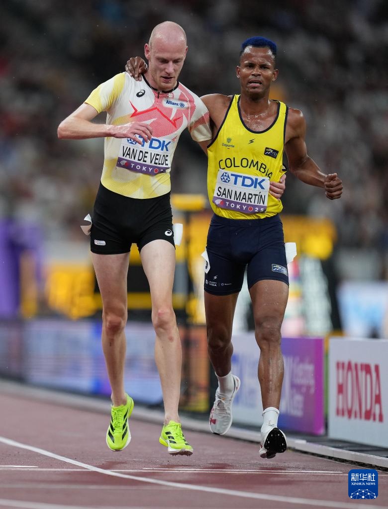 9月13日,比利時選手蒂姆·范德韋爾德(左)攙扶受傷的哥倫比亞選手卡洛斯·圣·馬丁沖過終點。