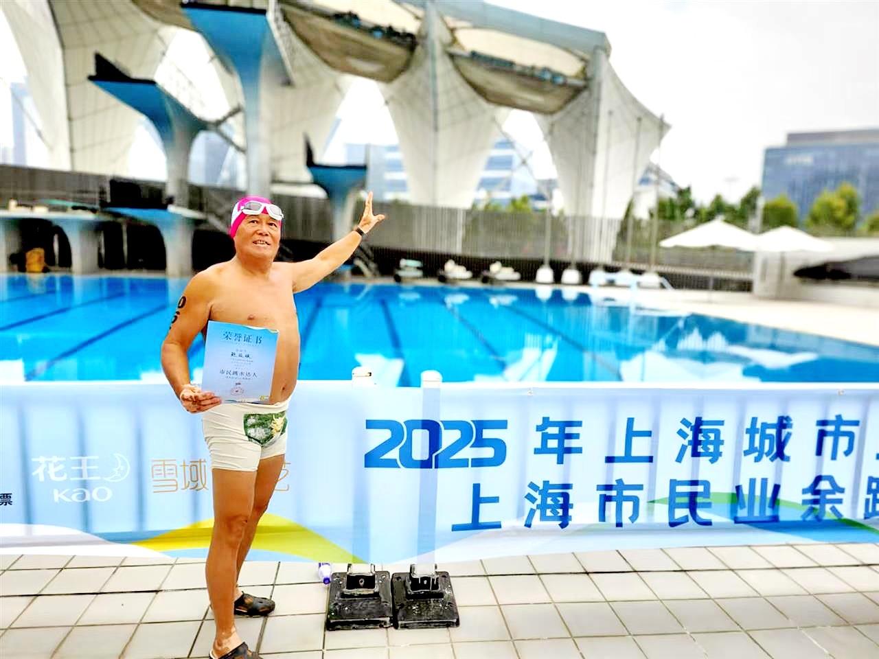 鮑政斌告訴記者,賽前他曾發生驚險一幕。練習時,他剛一入水,右小腿便一陣刺痛,感覺大事不好:抽筋了!原來,這幾天他忙于訂票、訂房、收拾裝備,沒有做熱身訓練,練習時突然發力,造成肌肉拉傷。他一瘸一拐上岸,狼狽地躲進更衣室,一邊按摩一邊拉伸,折騰了十幾分鐘,肌肉漸漸發熱,小腿劇痛竟奇跡般消失了。隨后的預賽,他取得老年組總分第2名的好成績,順利進入決賽。