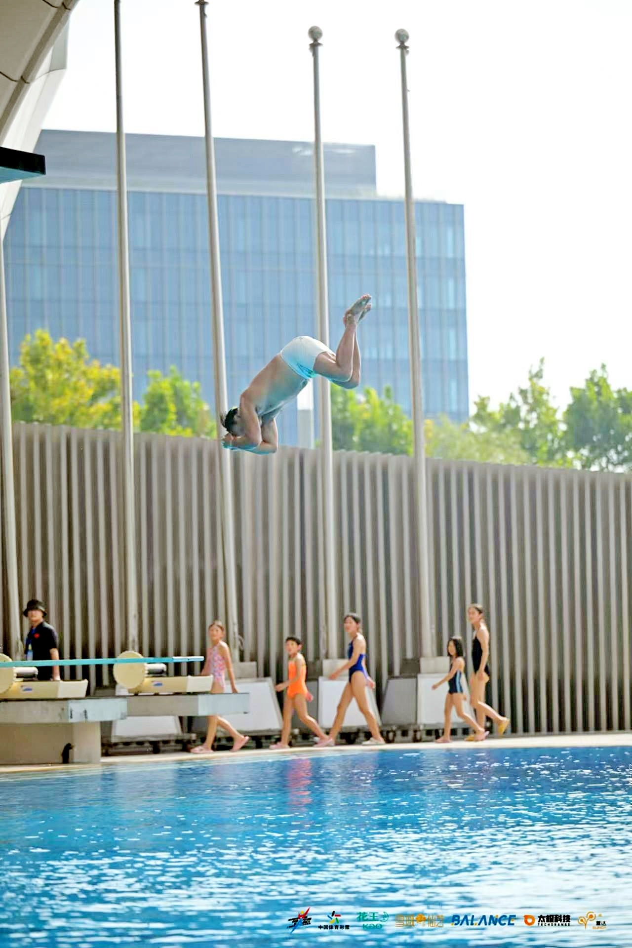 根據比賽規則,第一跳要求腳先入水,選手們全部選擇“冰棍式”“插蠟燭”,即直體雙腳入水。惟獨鮑政斌別出心裁,大步邁向跳臺,背對觀眾,前腳掌立起支撐身體,后腳掌懸空,雙手平舉,隨后大喝一聲“起”,雙腳用力蹬臺,雙臂和腰部同時向后充分發力,用巨大的合力推動180斤的身體向后快速翻騰360度,最后雙腳穩穩入水,激起一片浪花和觀眾的尖叫。