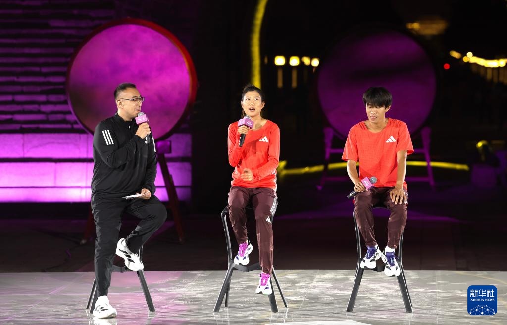 9月14日,在北京永定門前,中國(guó)馬拉松運(yùn)動(dòng)員李丹(中)、陳雨繁(右)在訓(xùn)練營(yíng)啟動(dòng)儀式上。