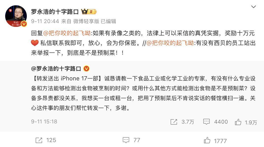 “之前我就說過,誰能把西貝做預制菜的證據弄出來,我就懸賞10萬元。西貝老板說可以來拍后廚,結果第二天全國媒體都去拍,也都拍到了,所以這個信息是誰提供的呢?就是他們公司提供的。”9月14日晚,羅永浩在直播間表示,在這種情況下,他要取10萬元現金,裝到牛皮紙袋,親手交到他們公司總部門口,“如果讓我進去我就進去,如果不讓進去,我就交給他們公司前臺。愿意跟我一起去的媒體給我發私信,到時候應該還會現場直播的。”
