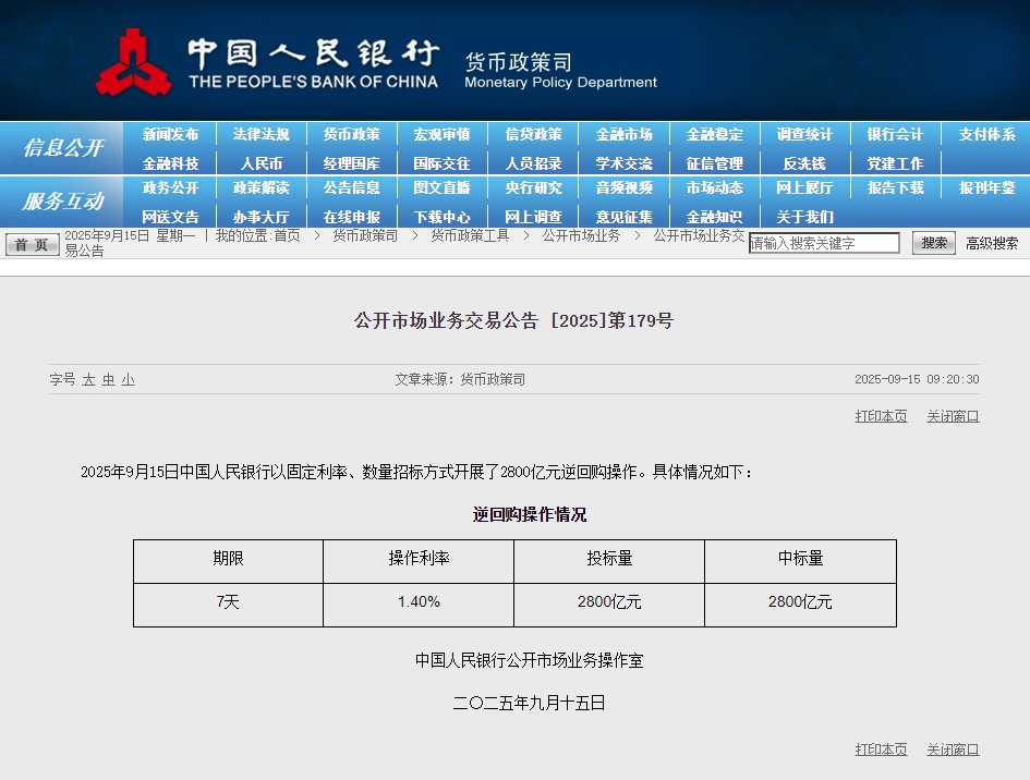 人民網北京9月15日電 (記者羅知之)據中國人民銀行網站消息,中國人民銀行今日以固定利率、數量招標方式開展了2800億元逆回購操作,中標利率1.4%。