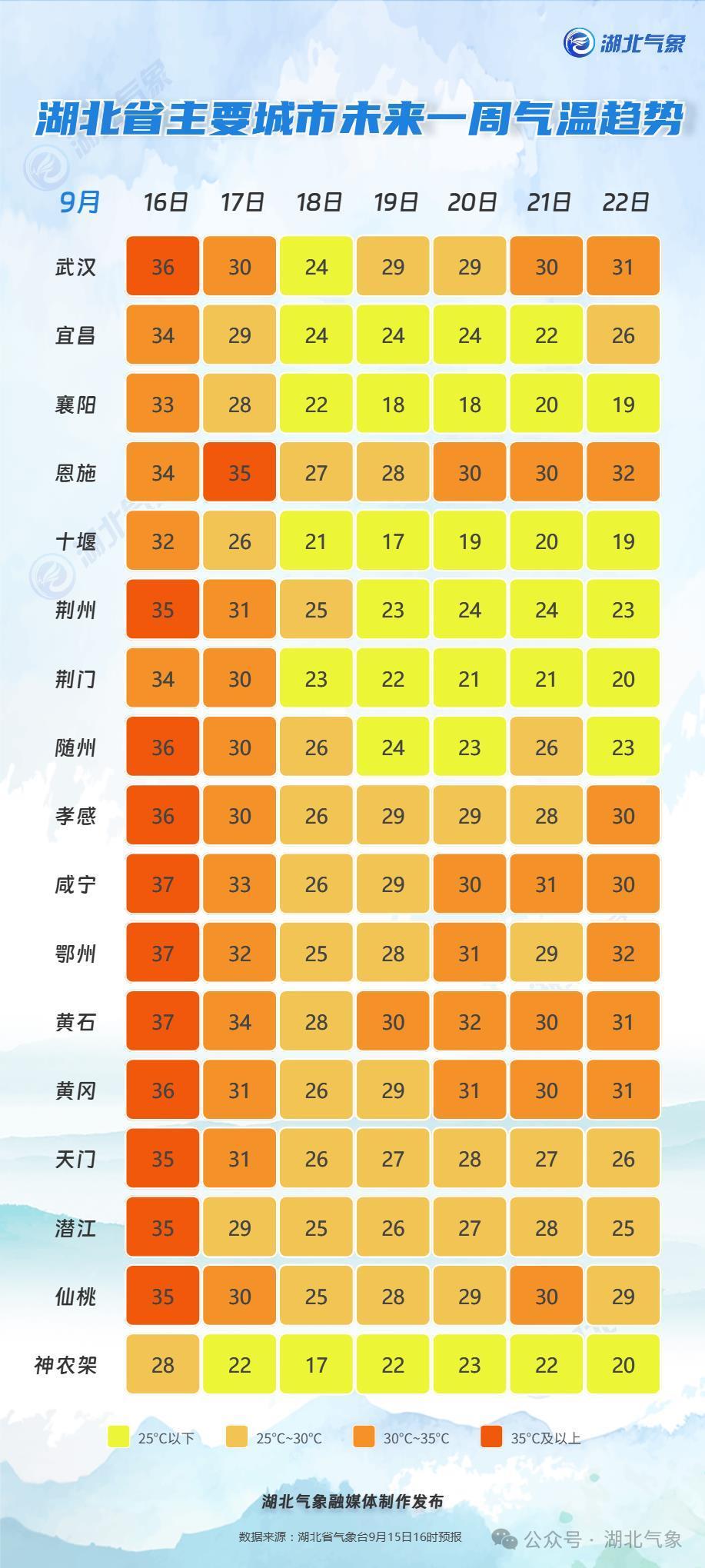 高溫還想進一步翹尾。16日(周二)湖北氣溫上升,尤其是中東部熱浪卷土重來,最高氣溫將升至34-38℃。