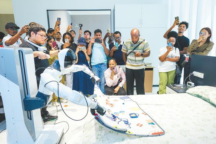 湖北人形機器人創新中心,來自武漢高校的留學生觀看人形機器人“干活”。 (湖北日報全媒記者 魏錸 攝)
