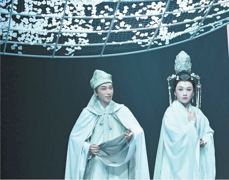 舞臺上,《帝女花》長演不衰,多個劇團進行了重塑排演,其中不乏創(chuàng)新求變的探索。桃花源粵劇工作舍于2022年制作了《帝女花》65周年巡演版,并細分為管弦光影版、學生戲臺版等多個不同版本,激發(fā)觀眾的思考與想象。2024年,廣東粵劇院推出曾小敏、文汝清主演的小劇場粵劇《帝女花·一念》,在保留經(jīng)典唱段的基礎(chǔ)上做簡化,嘗試注入新的時代氣息。劇中,曾小敏不僅飾演了戴花冠、著宮裝的長平公主,還扮演了穿越古今的素衣女子,引領(lǐng)觀眾穿越古今,體驗長平公主的前世今生。