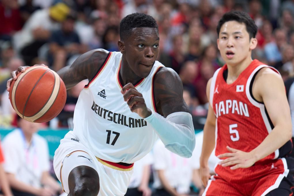 2024年7月27日,德國隊球員施羅德(左)在巴黎奧運會男子籃球小組賽中。新華社記者 孟鼎博 攝