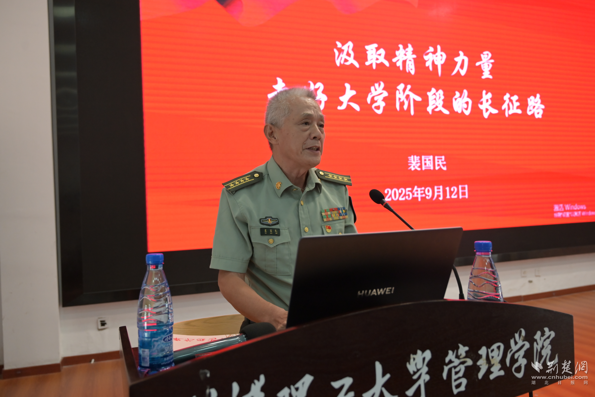 荊楚網(湖北日報網)訊(通訊員常夢星)“同學們,你們喜歡騎單車嗎?你們對長征了解多少?”9月12日下午,在武漢理工大學管理學院報告廳,武漢市軍休四中心軍休干部、“老兵宣講團”成員裴國民以自己騎行重走長征路的真實經歷,為560余名管理學院2025級新生帶來了一堂深刻而動人的“開學第一課”。
