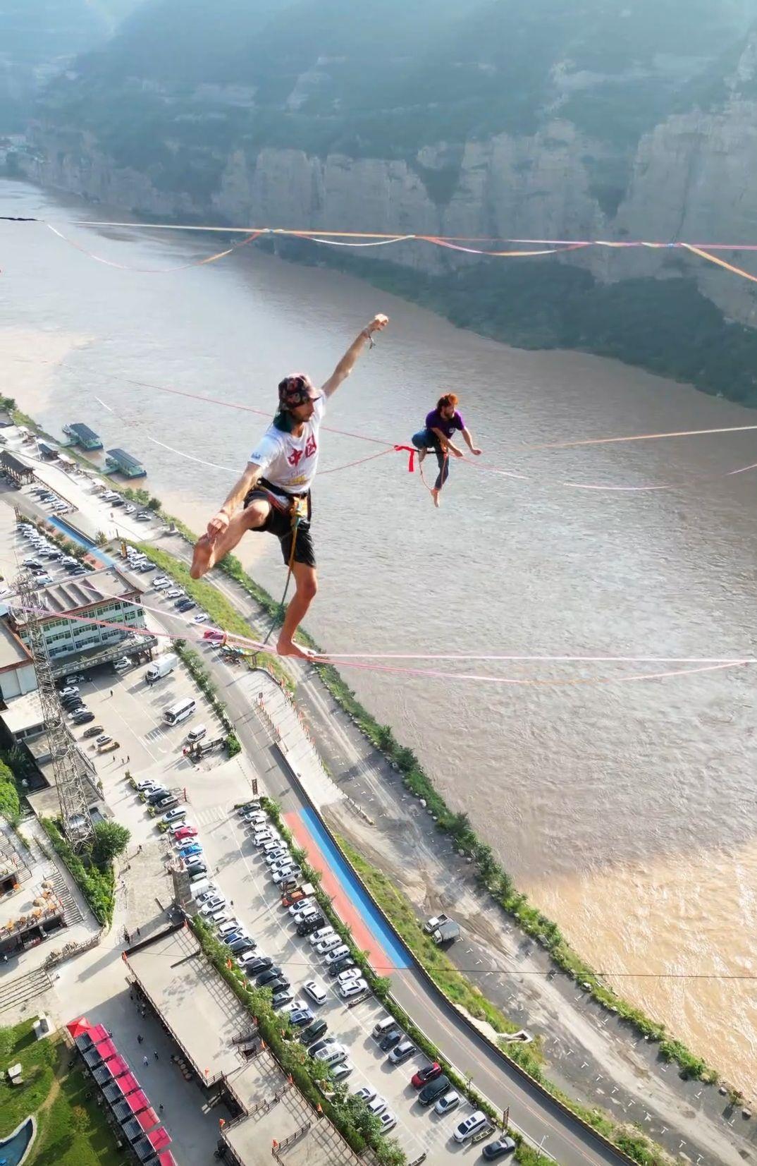 9月13日至16日,黃河大梯子崖高空扁帶國際挑戰賽暨高空舞龍表演在山西河津舉行,來自世界各地的極限運動員集聚黃河岸邊,不借助任何外力,在180多米高、2.5厘米寬的扁帶上競速,上演黃河絕壁間的“速度與激情”。