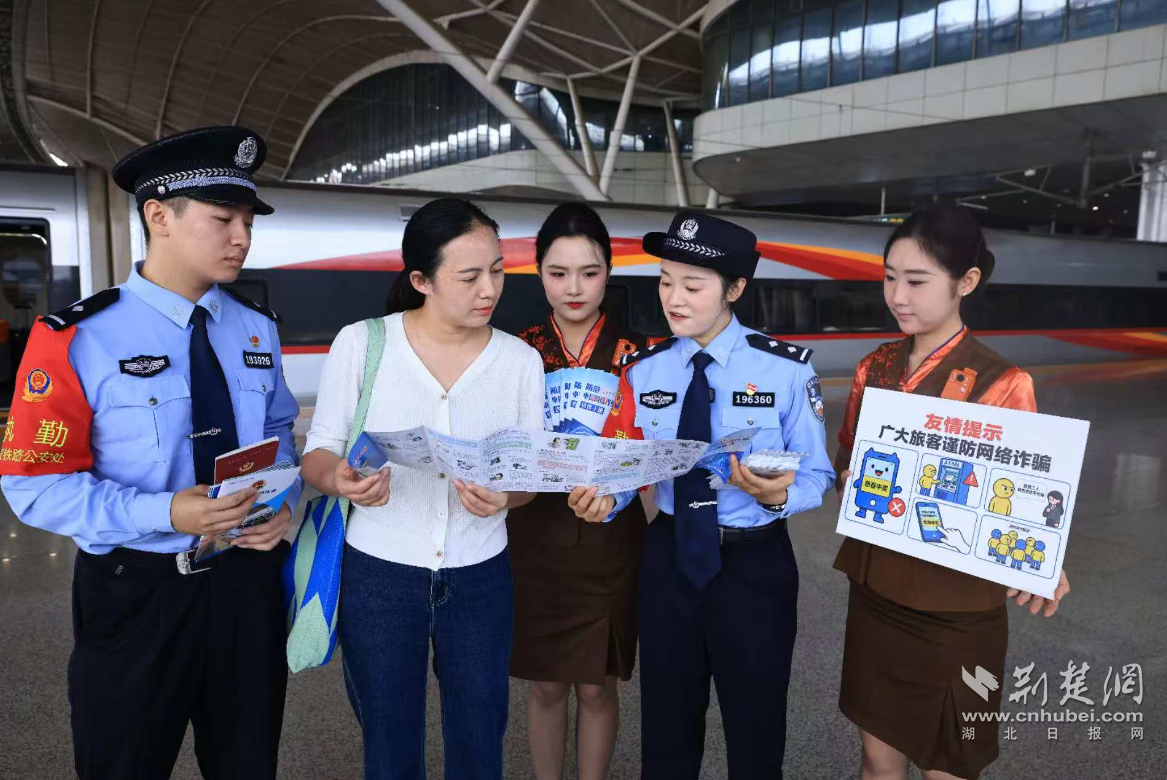 在武漢站候車大廳,民警通過發放宣傳冊、現場講解、互動問答等方式,向過往旅客普及網絡安全知識,提醒大家警惕電信網絡詐騙,保護好個人信息。