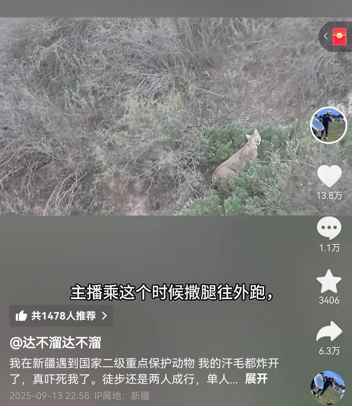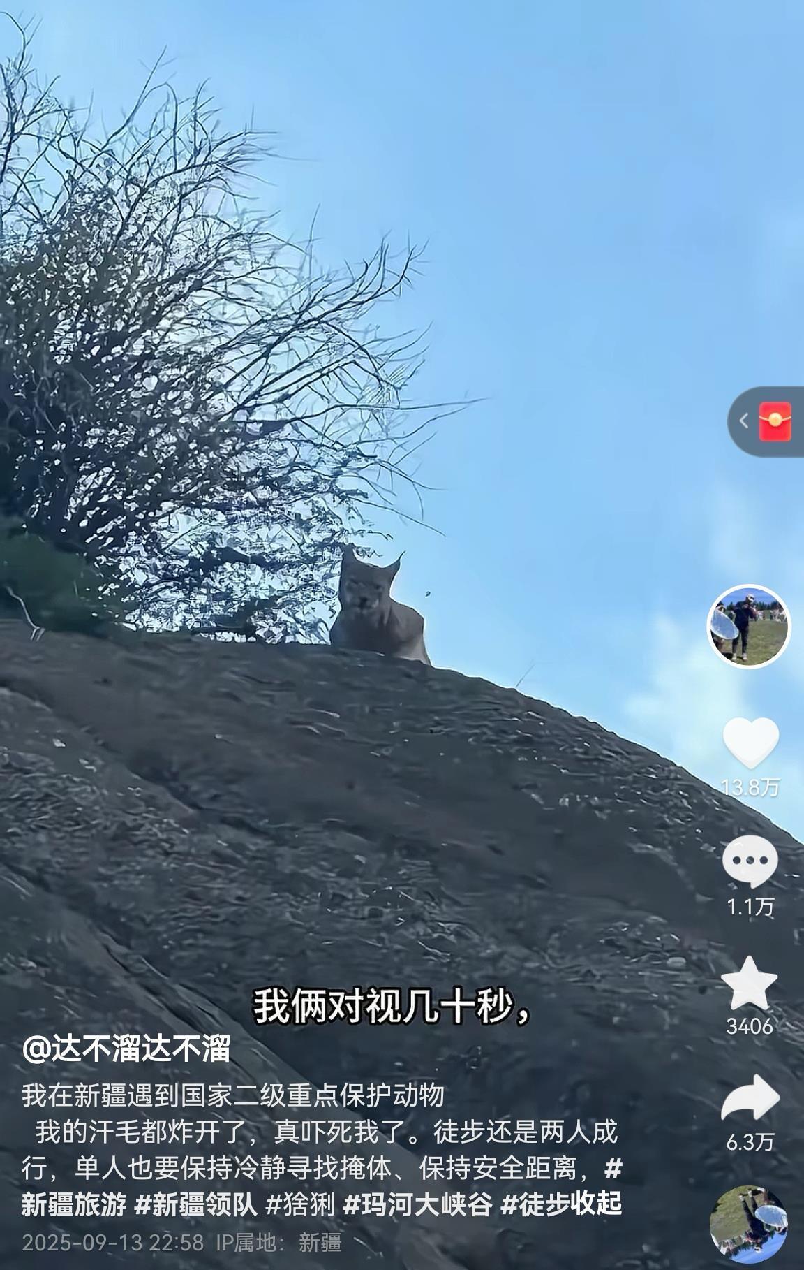 有游客日前發視頻稱,他在新疆瑪河大峽谷一個人徒步時,遇到國家二級保護動物猞猁,“汗毛都炸開了,真嚇死我了!”。