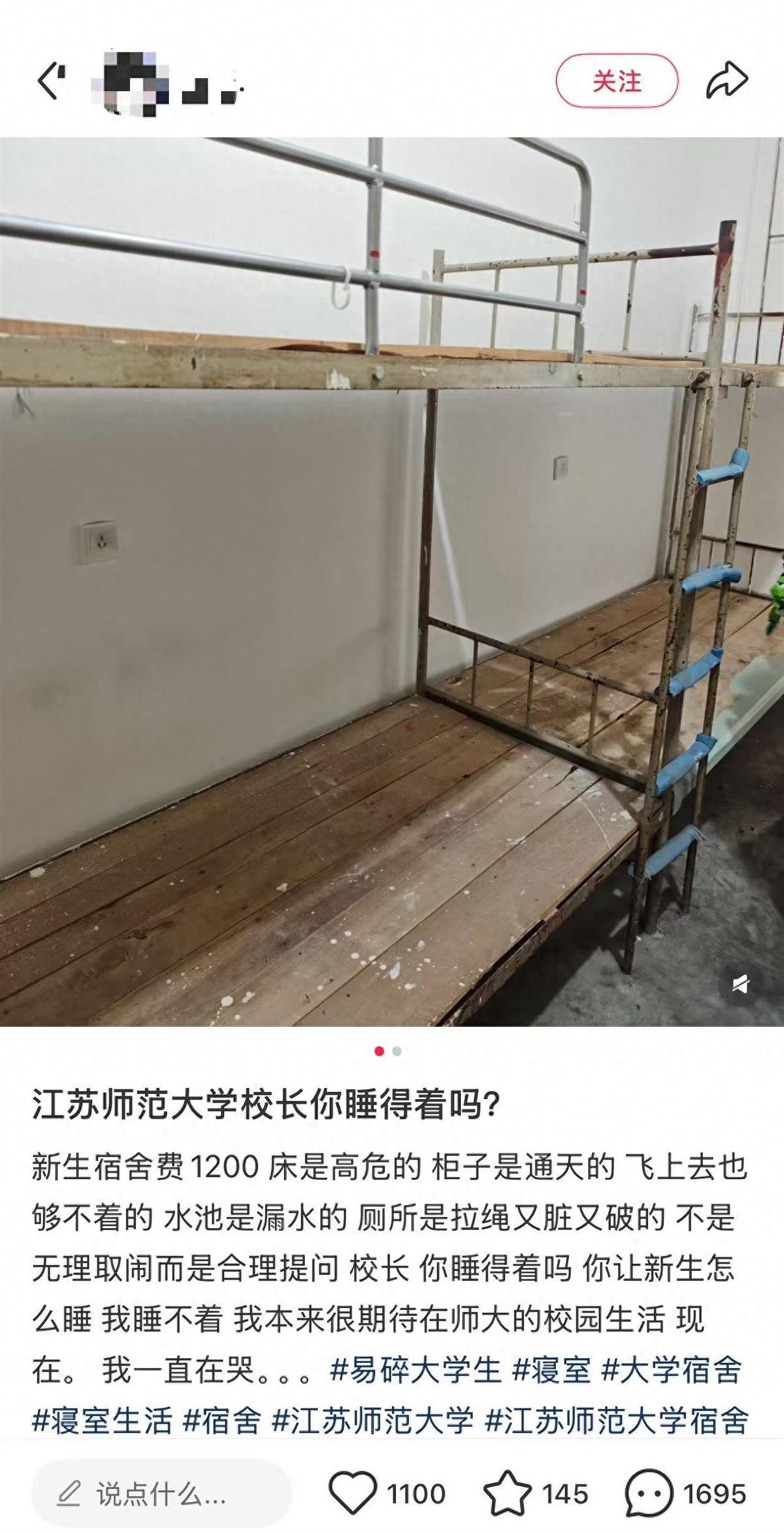 據(jù)媒體報(bào)道,有網(wǎng)友發(fā)帖稱江蘇師范大學(xué)泉山校區(qū)個別宿舍樓環(huán)境差。照片顯示,宿舍內(nèi)分上下鋪,床架有嚴(yán)重銹跡,座椅、木柜比較簡陋。網(wǎng)友配文稱:“新生宿舍費(fèi)1200床是高危的,柜子是通天的,飛上去也夠不著的,水池是漏水的……我本來很期待在師大的校園生活,現(xiàn)在,我一直在哭。”