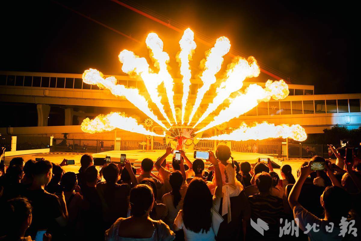 當佳肴撫慰了味蕾,夜色下的精彩才剛剛拉開帷幕。今年,西壩不夜城全新推出系列夜游演藝,為“煙火氣”增添了更多“詩意”與“活力”。大型半室內(nèi)主題情景演藝《宜昌1938》,借助真人實景演出,并運用全息投影、裸眼3D等先進技術(shù),生動再現(xiàn)當年宜昌大轉(zhuǎn)運的壯闊史詩,讓游客在沉浸式體驗中感受歷史的厚重。除了主題演藝,景區(qū)還打造了六大節(jié)點式、多場景互動表演,既有火壺、火立方等展現(xiàn)東方火焰美學(xué)的精彩演出,也有機械霓虹與傳統(tǒng)飛天舞蹈相融的賽博敦煌,還有充滿復(fù)古氛圍的Disco街頭派對,涵蓋歷史文化、非遺演出、科技光影秀、互動情景劇等多種形式,真正實現(xiàn)“移步換景、步步驚喜”。