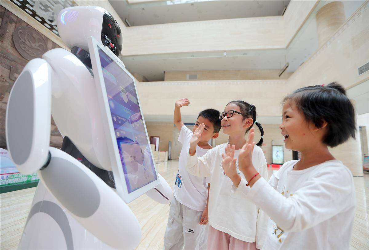 小朋友與機器人互動,了解荊門歷史文化知識。