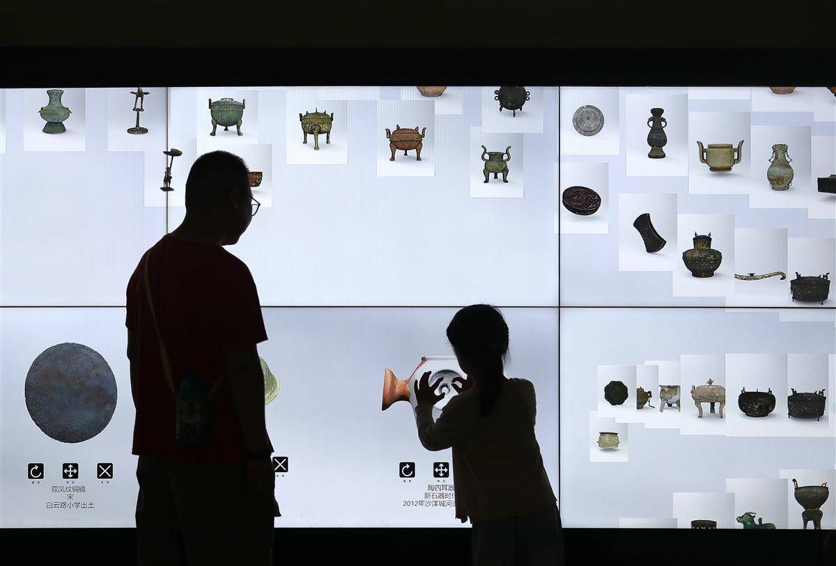 小朋友正通過點擊觸摸屏查看館藏文物,可清晰看到文物紋飾與鑄造痕跡。