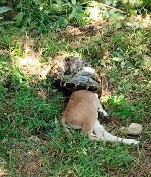 近日有網(wǎng)友反映,9月14日,廣東汕尾陸河縣河田鎮(zhèn)山上有蟒蛇在吃牛。視頻顯示,一條滿身斑紋的大蛇纏住了小牛的頭部,小牛已無法動彈。視頻發(fā)布者描述,發(fā)現(xiàn)時牛頭已經(jīng)被吞下一半。