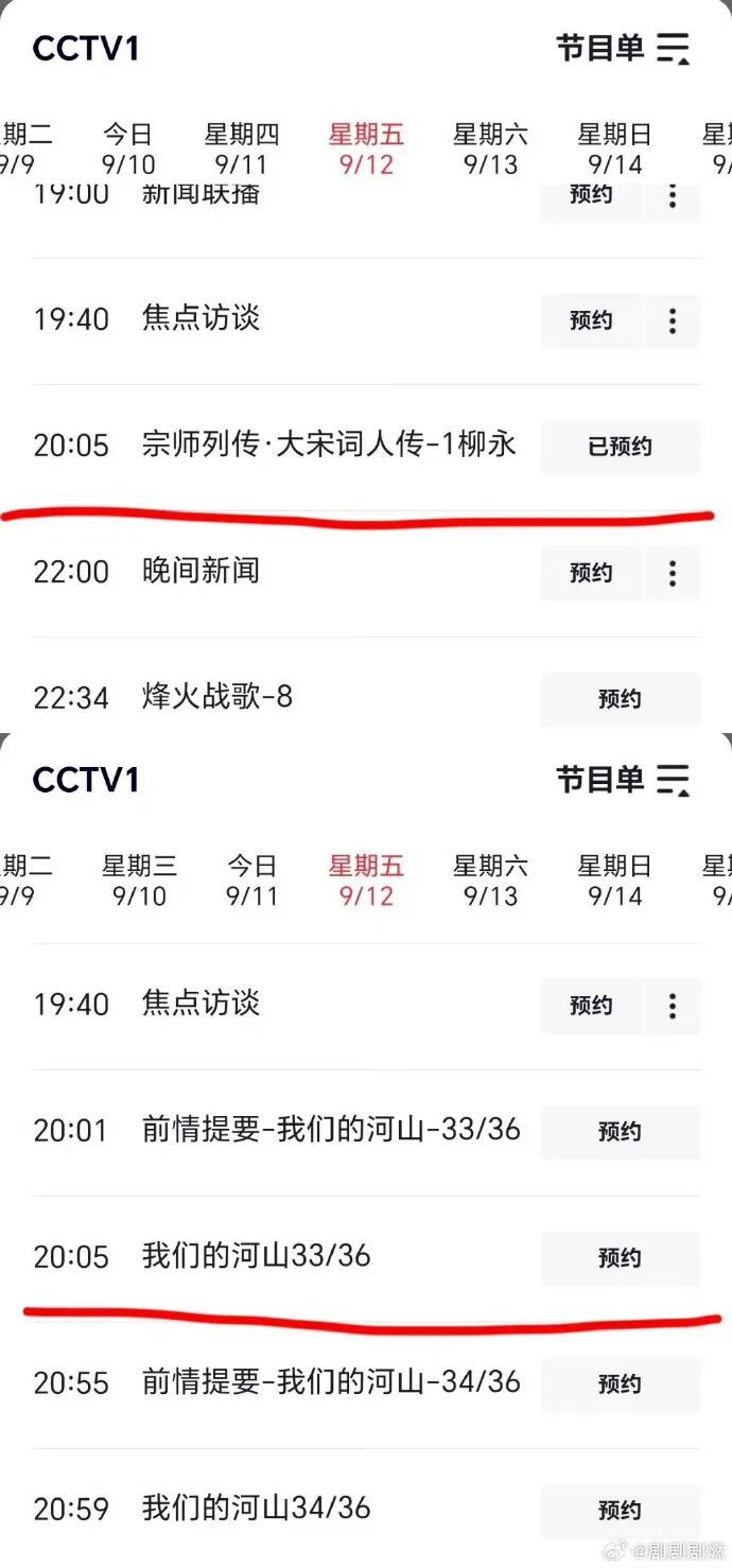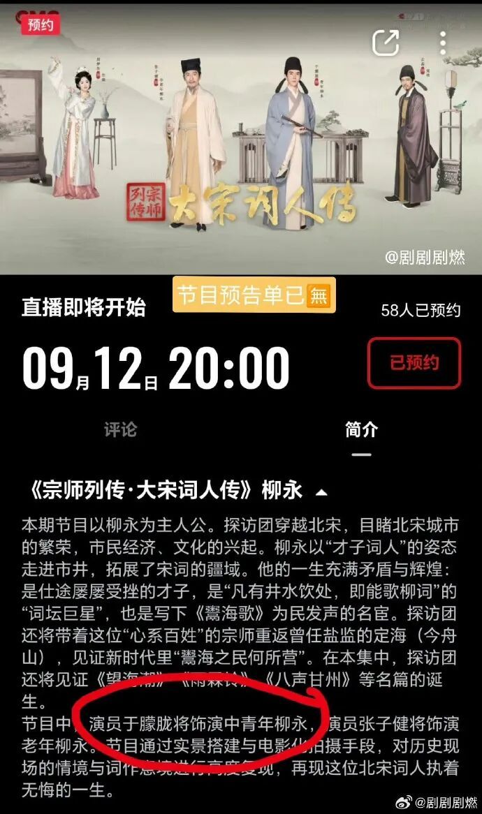 據(jù)央視網(wǎng),原計(jì)劃9月12日20:05在CCTV1播出的《宗師列傳·大宋詞人傳》,已被替換為電視劇《我們的河山》。于朦朧在該節(jié)目中飾演北宋詞人柳永的青年時(shí)期。