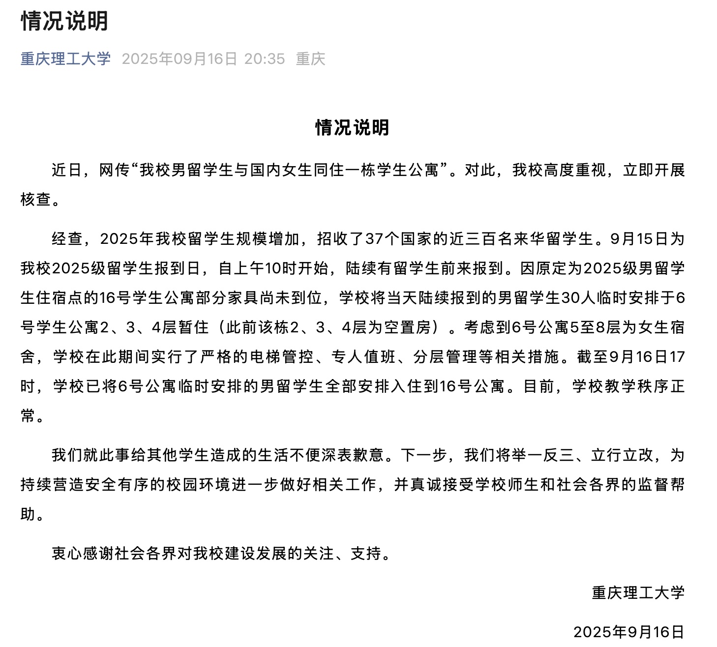 必須看到,時間并不緊張。重慶理工大學亦在情況說明中承認“2025級留學生規模增加”,卻直到報到當日才發現“16號公寓部分家具尚未到位”,只得讓男生“借宿”女生樓。從招生到開學,長達數月,卻仍出現“家具未到、宿舍沒好”的尷尬,無論如何說不過去。