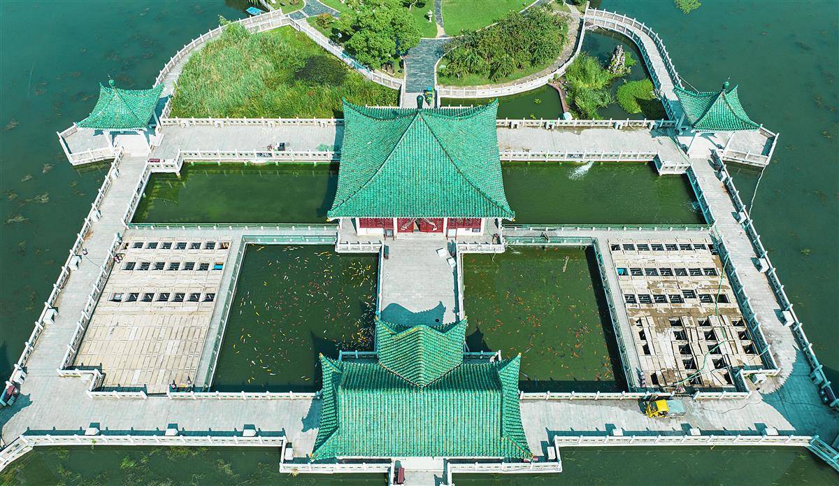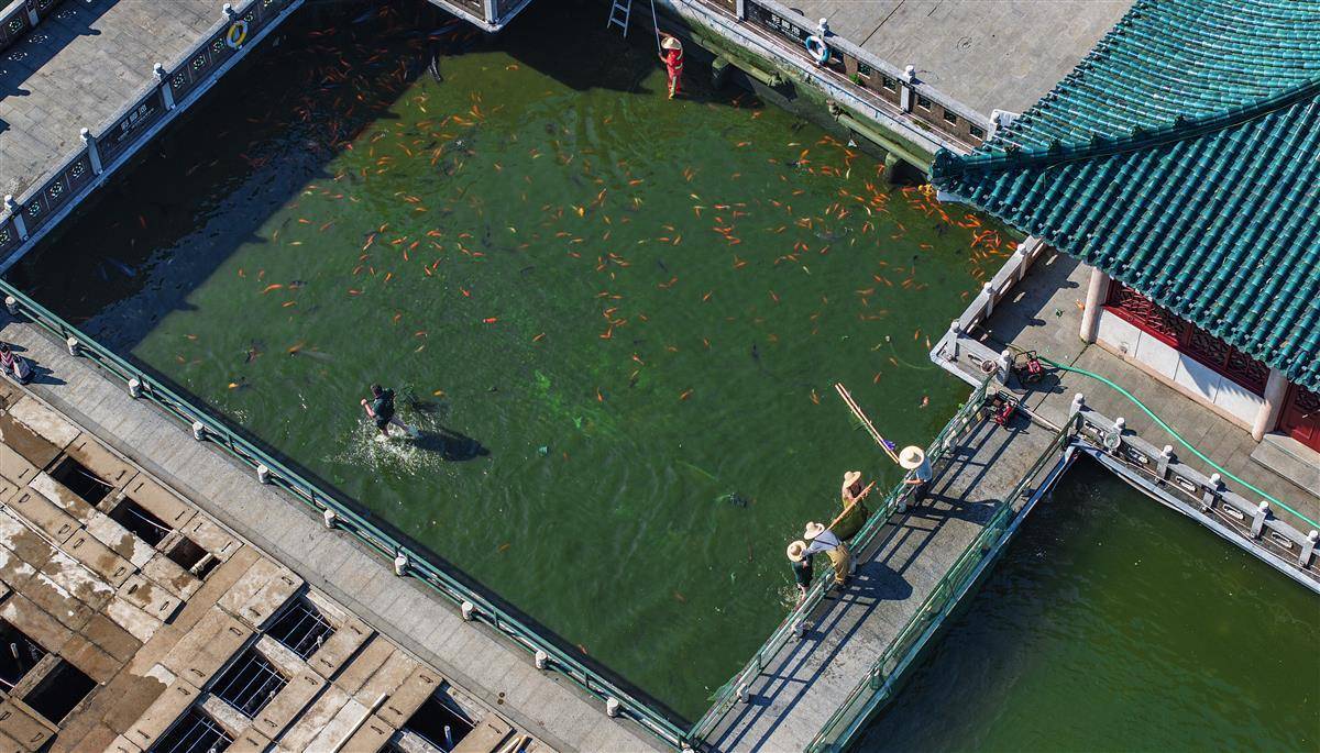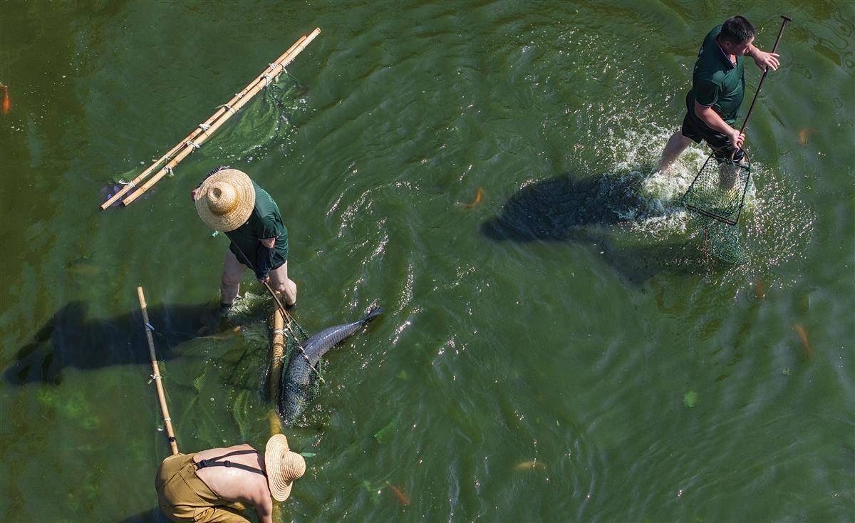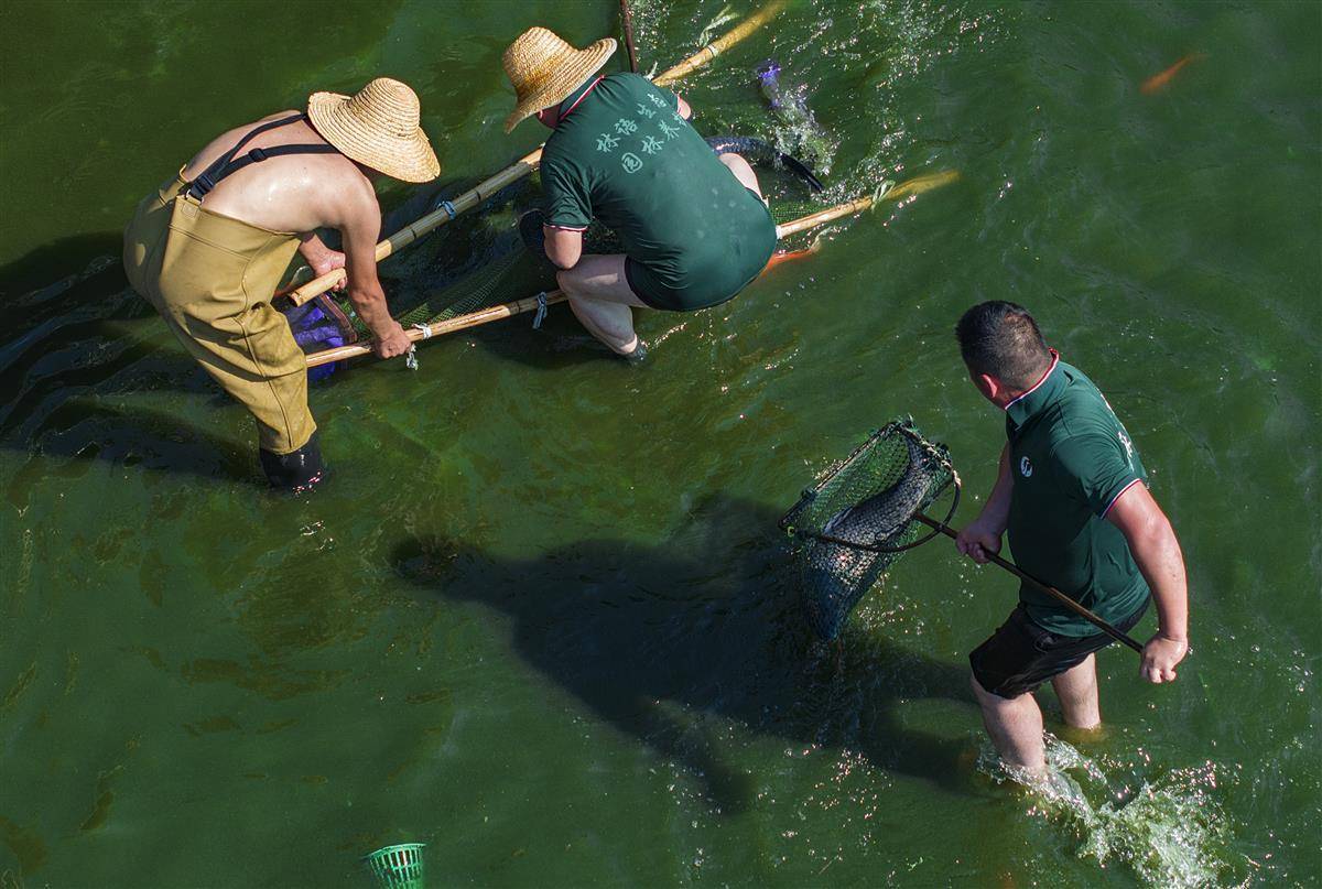 9月16日上午,東湖聽濤景區碧潭觀魚的魚池里,數名工作人員正在轉移觀賞魚,近100斤重的觀賞魚被抬著轉移到維修改造后的魚池里。為進一步提升聽濤景區游覽環境,碧潭觀魚景點將于2025年9月2日起實施維修改造工程,預計工期15天。(湖北日報全媒記者 朱熙勇 攝)