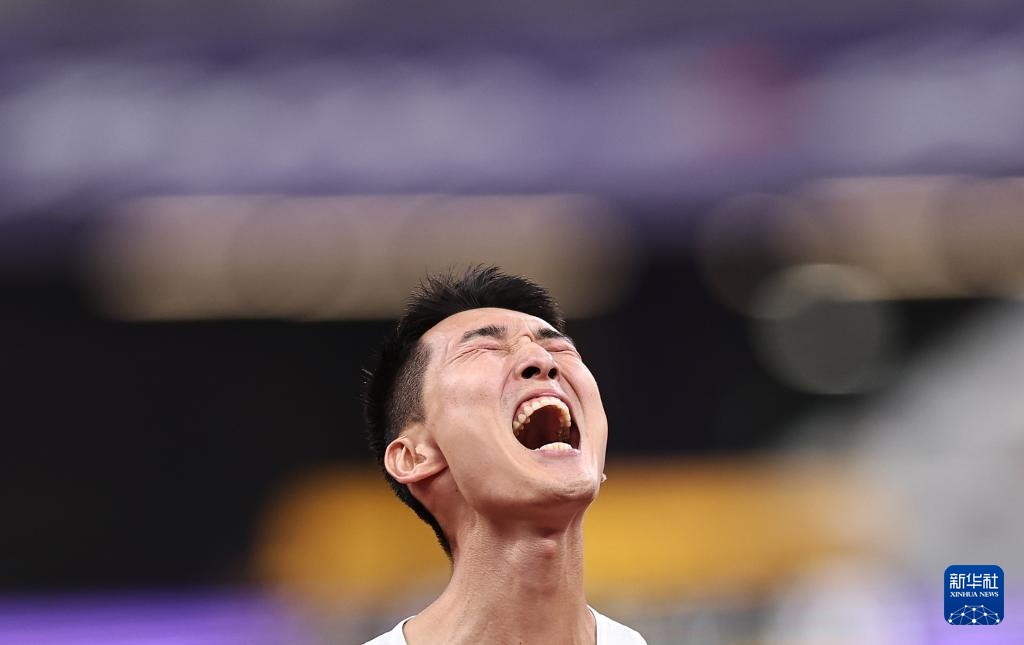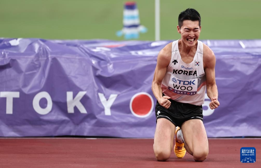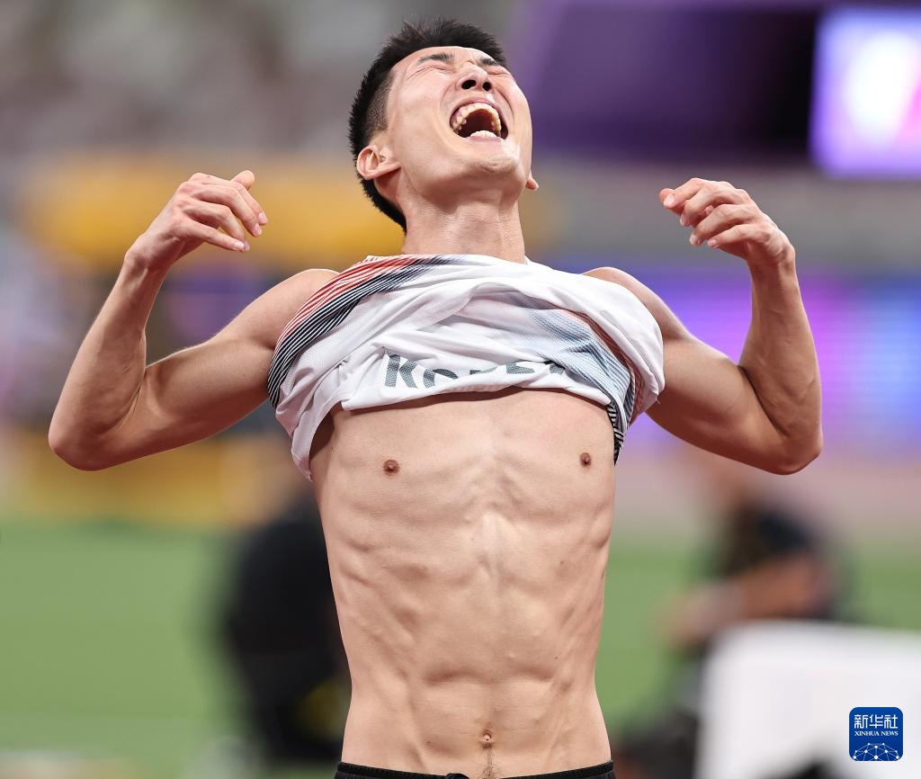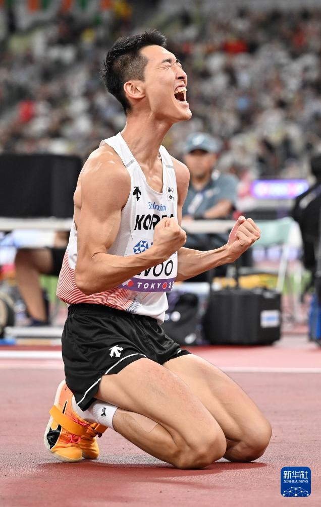 9月16日,韓國選手禹相赫在決賽中試跳成功后慶祝。