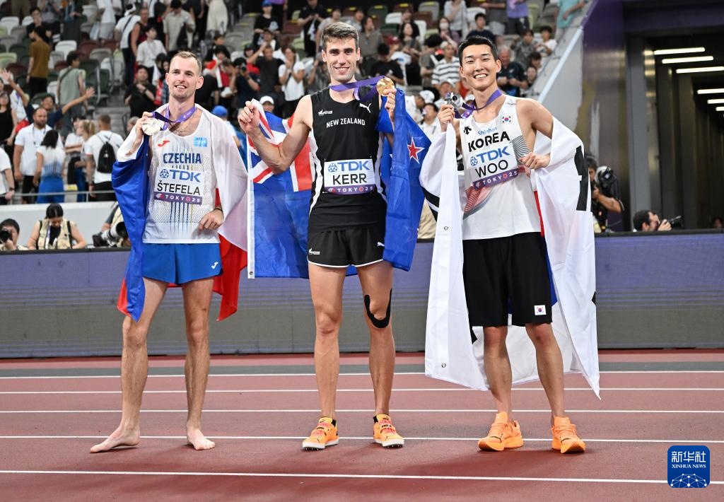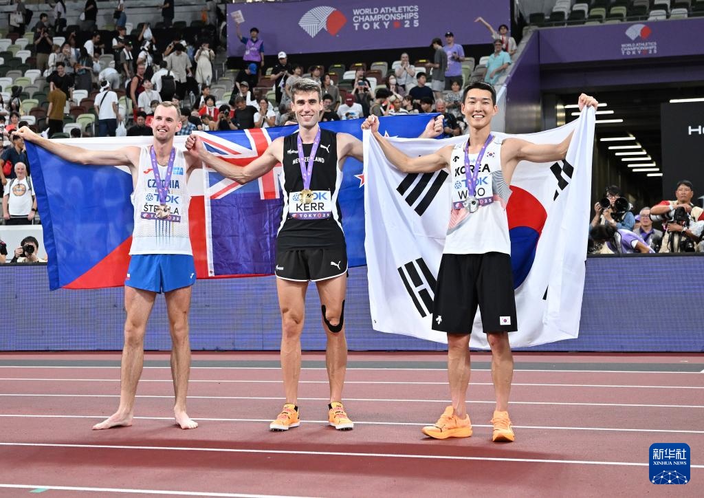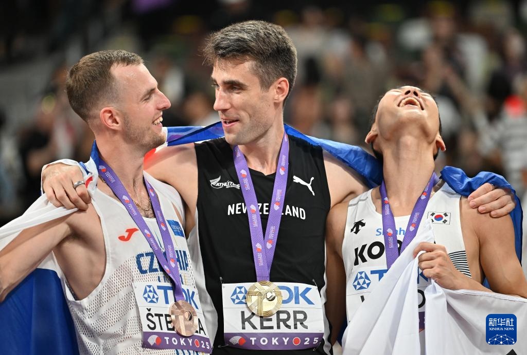 9月16日,冠軍新西蘭選手科爾(中)、亞軍韓國選手禹相赫(右)和季軍捷克選手斯特菲拉在決賽后慶祝。