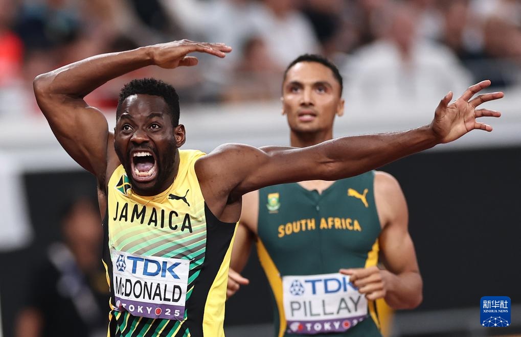 9月16日,牙買加選手麥克唐納(前)在晉級決賽后慶祝。