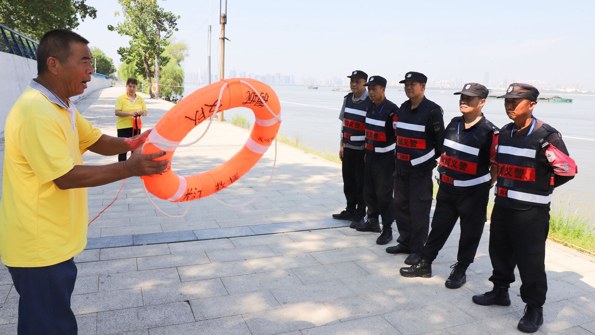 “大家穿著的工作服在水中會產生很大的阻力,如果需要下水施救,一定要將上衣脫掉,這也是對我們自己的一種保護。”接下來,來自長江志愿救援隊的專業人員為大家帶來了一場救生救援及急救技能培訓,通過現場講述與實操結合的方式,向義警隊員們介紹了救生圈、救生繩、救生桿、救生衣等救生工具的布設位置、使用方法以及面對溺水人員的急救措施。