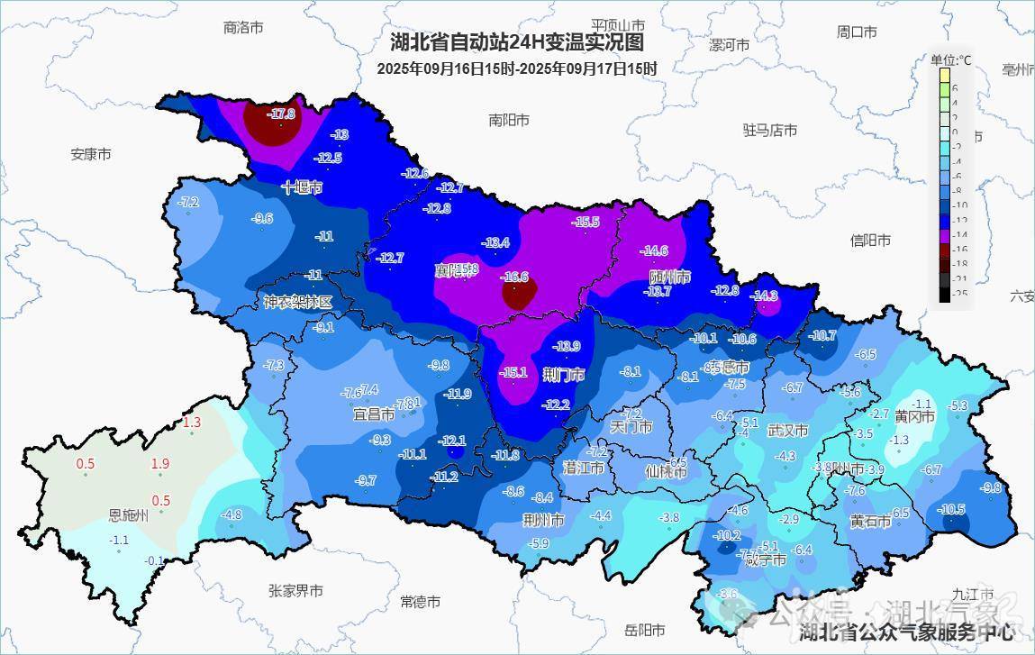 湖北日報訊(記者曾莉)降溫了!在雨水和冷空氣的雙重打擊下,9月17日15時,十堰、襄陽、神農架等地氣溫不足20℃,鄖西氣溫僅12.7℃,較16日同一時次下降了近18℃。預計未來三天,鄂西北仍多降雨,局地有大雨或暴雨。氣溫持續走低,鄂西北和江漢平原北部最高氣溫將不足20℃,中東部部分地區最低氣溫也將創下半年新低,全省會有5到7級偏北陣風。