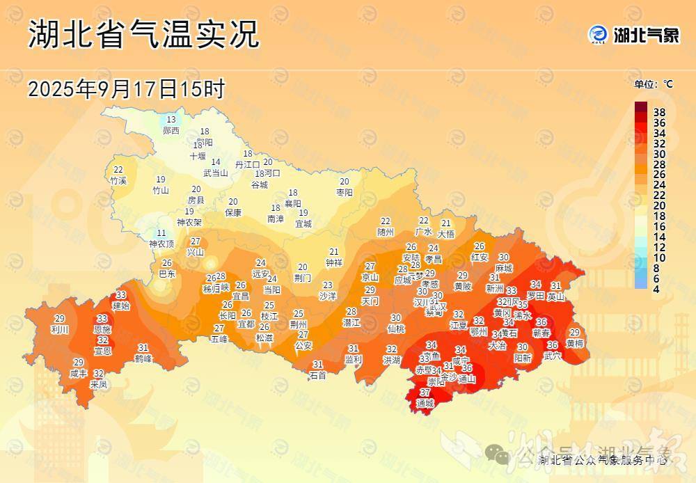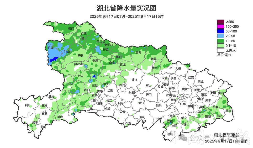 氣象觀測顯示:16日,受低渦切變影響,十堰、襄陽、隨州等地出現大到暴雨,部分地區大暴雨,南漳縣武安鎮出現263.1毫米的特大暴雨。17日白天,西部地區的降雨還在繼續,7至15時西部和東部部分地區出現分散性陣雨或雷陣雨,其中十堰和宜昌局地出現暴雨,隨州、黃岡、黃石、咸寧等9個縣市區的15個鄉鎮出現8到9級雷暴大風。在冷空氣的影響下,省內大部地區陸續降溫,十堰、襄陽、隨州、荊門等多地降溫幅度都在10℃以上。不過,在冷空氣還未觸及的咸寧、黃岡東部、黃石等地高溫依然頑強,13時赤壁氣溫甚至達37.7℃。