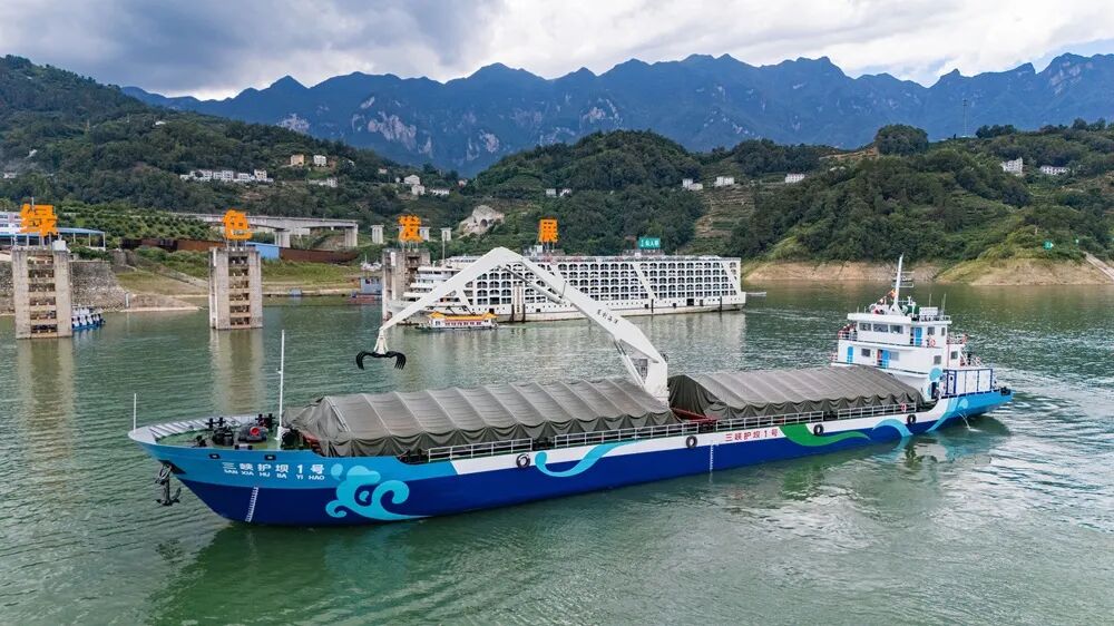 8月20日,國內首艘4E級純電動清漂轉運船“三峽護壩1號”在三峽庫區水域試航。(彭強 攝)
