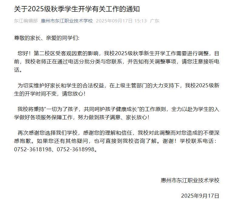 9月17日下午,惠州市東江職業(yè)技術(shù)學(xué)校發(fā)布《關(guān)于2025級秋季學(xué)生開學(xué)有關(guān)工作的通知》稱,第二校區(qū)受客觀因素的影響,2025級秋季新生開學(xué)工作需要進(jìn)行調(diào)整。“為切實(shí)維護(hù)好家長和學(xué)生的合法權(quán)益,在上級主管部門的大力支持下,我校2025級新生的開學(xué)時間不變,請您放心!”