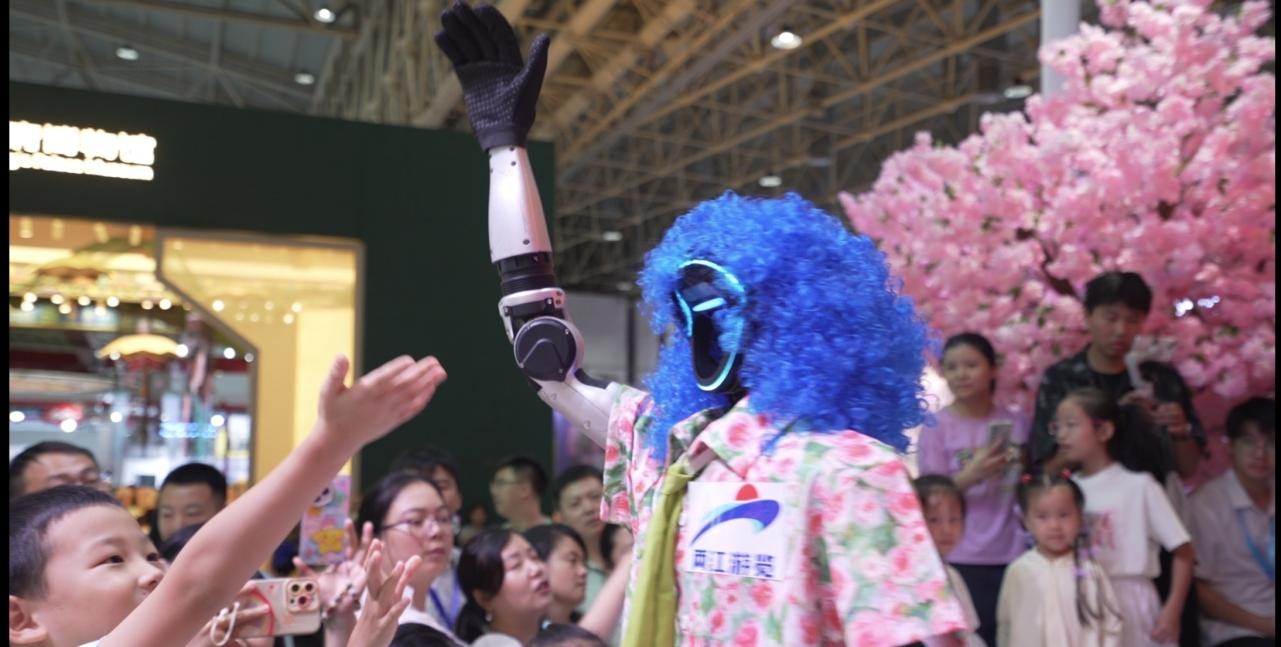 上午10時(shí)許,一身時(shí)尚新葉綠色的潮酷機(jī)器人“江大寶”緩緩移動(dòng)到展臺(tái)中央,它靈活地轉(zhuǎn)動(dòng)機(jī)械臂,向觀眾揮手致意,十幾平方米的展臺(tái)立馬便被圍得水泄不通。最興奮的當(dāng)屬參觀的孩子們,看見“江大寶”友好地伸出手,小朋友們便爭(zhēng)先恐后地與“江大寶”握手互動(dòng),這一溫馨的場(chǎng)面讓在場(chǎng)的所有人都露出了溫暖的笑意。