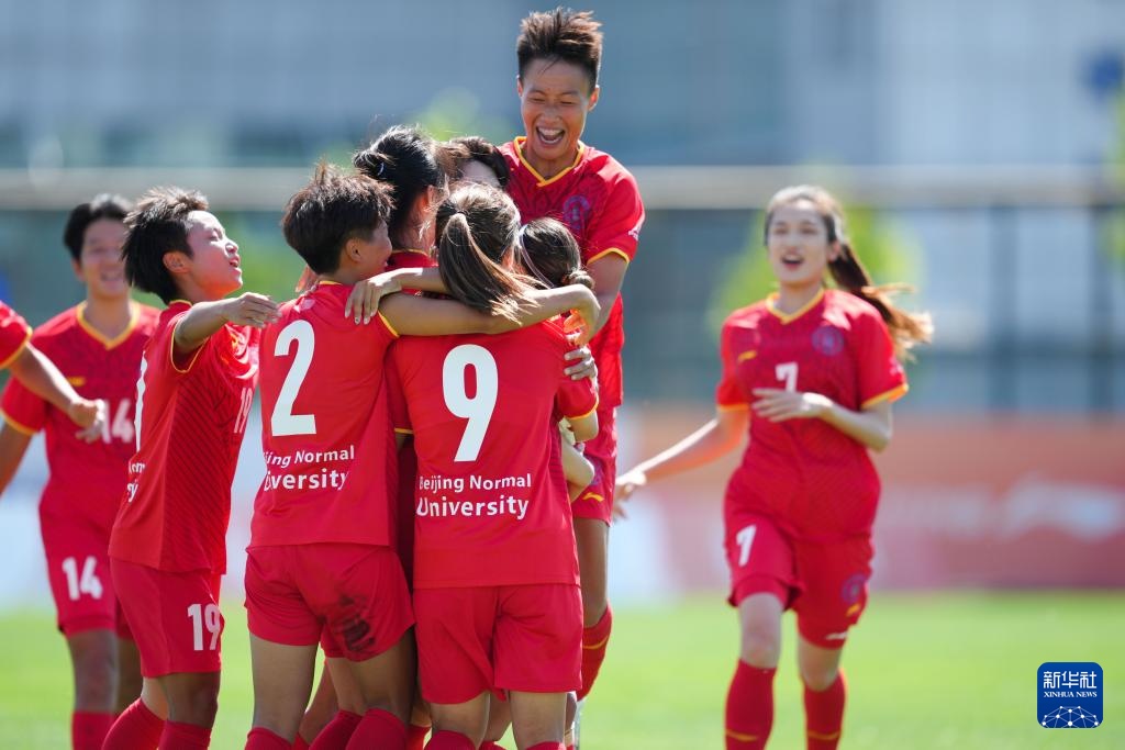 9月18日,北京師范大學女足球員在比賽中慶祝進球。