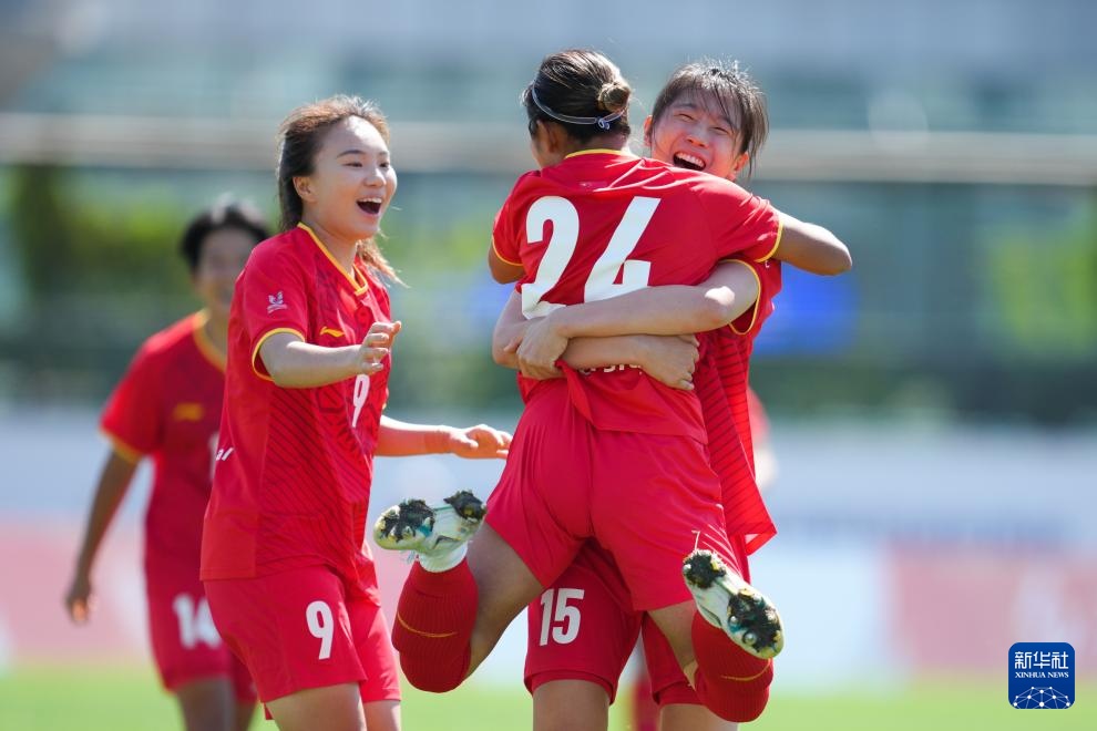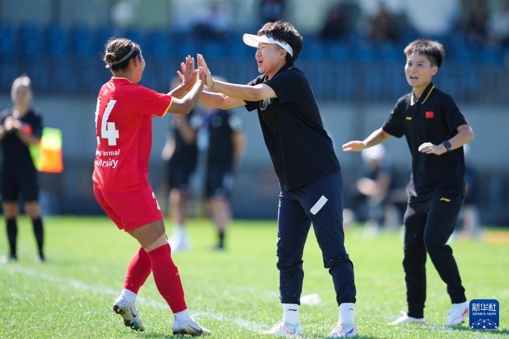 9月18日,北京師范大學女足球員馬玉琳(左)在比賽中與主教練畢妍慶祝進球。